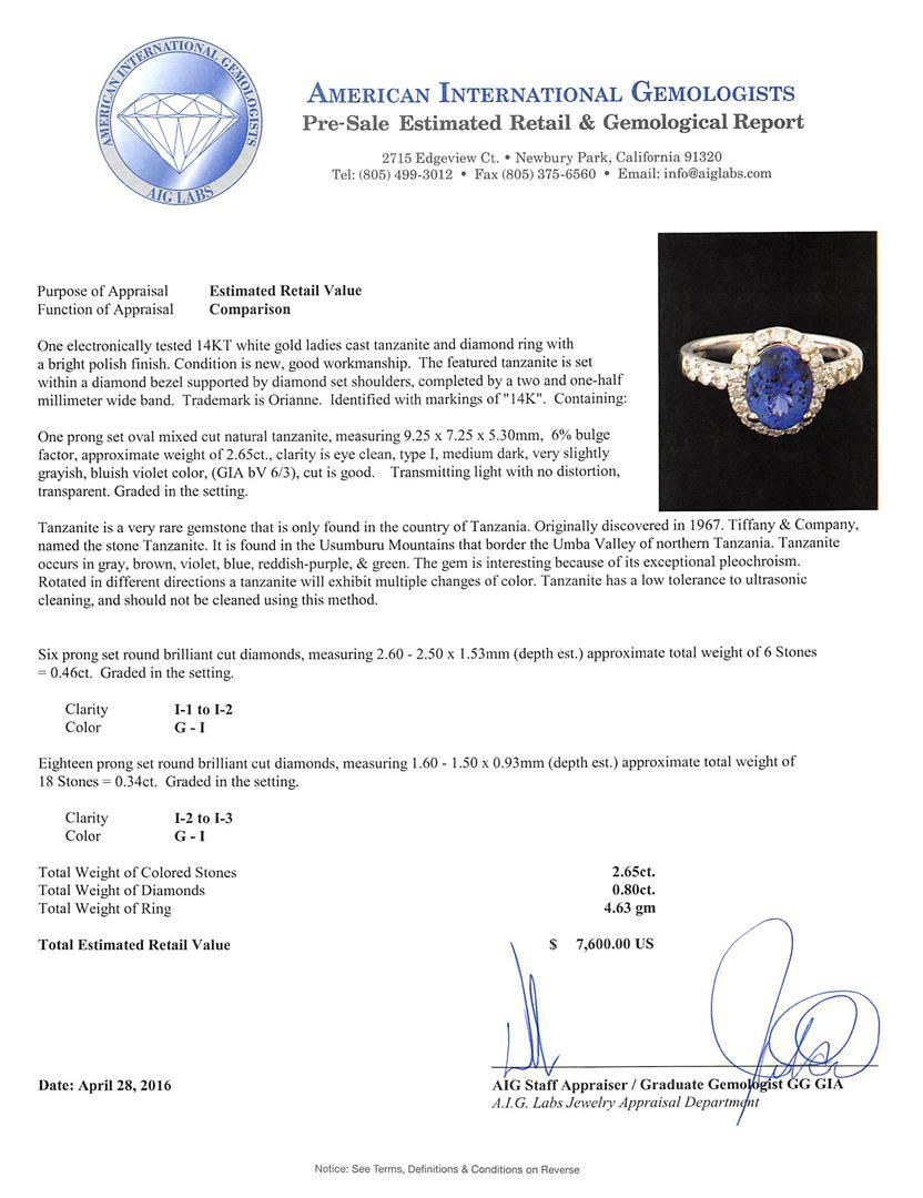 One electronically tested 14KT white gold ladies cast tanzanite and diamond ring with a bright polish finish. The featured tanzanite is set within a diamond bezel supported by diamond set shoulders, completed by a two and one-half millimeter wide band. Trademark is Orianne. Identified with markings of "14K". Condition is new, good workmanship. Containing: One prong set oval mixed cut natural tanzanite, measuring 9.25 x 7.25 x 5.30mm, 6%. bulge factor, approximate weight of 2.65ct., clarity is eye clean, type I, medium dark, very slightly grayish, bluish violet color, (GIA bV 6/3), cut is good. Transmitting light with no distortion, transparent. Graded in the setting. Tanzanite is a very rare gemstone that is only found in the country of Tanzania. Originally discovered in 1967. Tiffany & Company, named the stone Tanzanite. It is found in the Usumburu Mountains that border the Umba Valley of northern Tanzania. Tanzanite occurs in gray, brown, violet, blue, reddish-purple, & green. The gem is interesting because of its exceptional pleochroism. Rotated in different directions a tanzanite will exhibit multiple changes of color. Tanzanite has a low tolerance to ultrasonic cleaning, and should not be cleaned using this method. Six prong set round brilliant cut diamonds, measuring 2.60 - 2.50 x 1.53mm (depth est.) approximate total weight of 6 Stones = 0.46ct. Graded in the setting. Clarity: I-1 to I-2. Color: G - I Eighteen prong set round brilliant cut diamonds, measuring 1.60 - 1.50 x 0.93mm (depth est.) approximate total weight of 18 Stones = 0.34ct. Graded in the setting. Clarity: I-2 to I-3. Color: G - I. Total Weight of Colored Stones 2.65ct. Total Weight of Diamonds 0.80 ct. Total Weight of Ring 4.63gm.