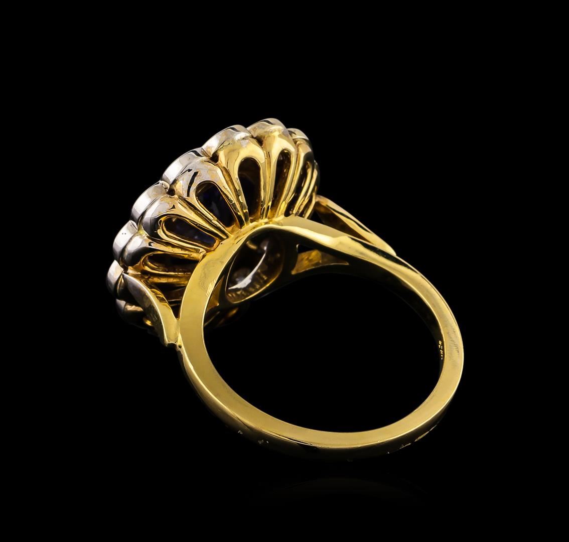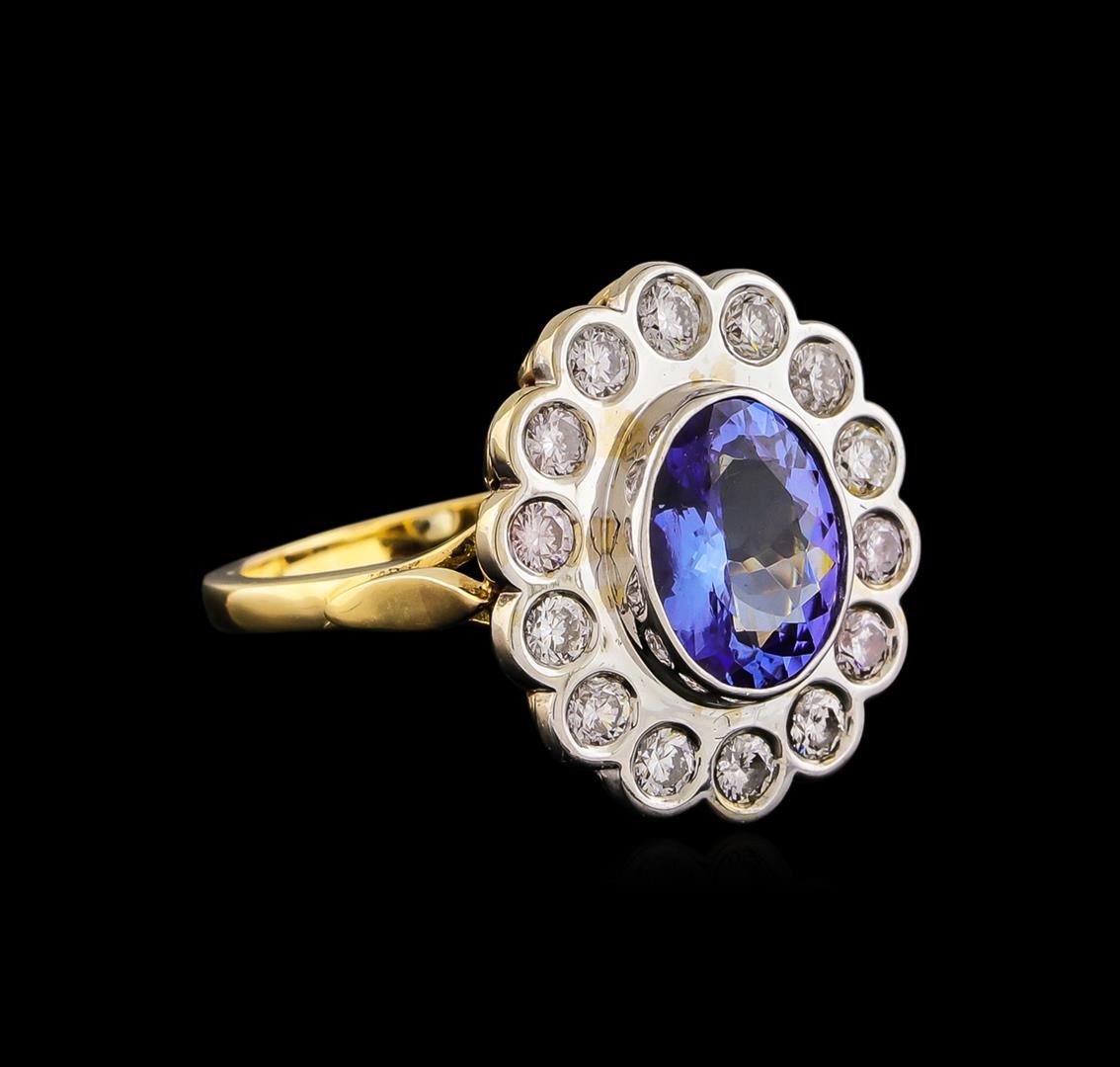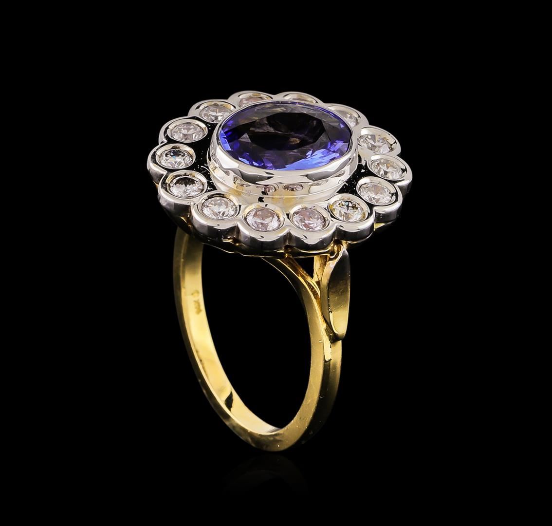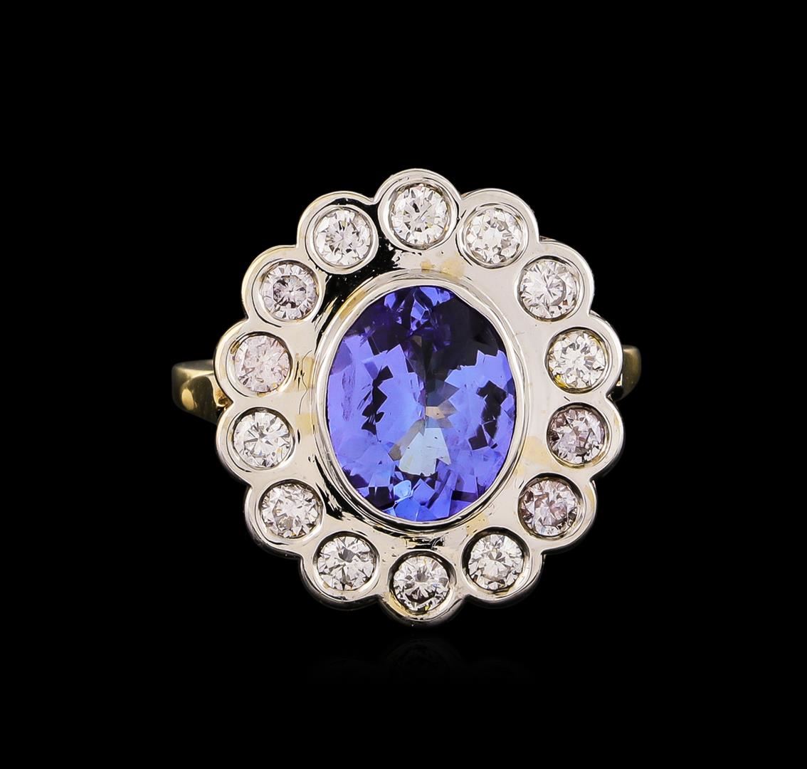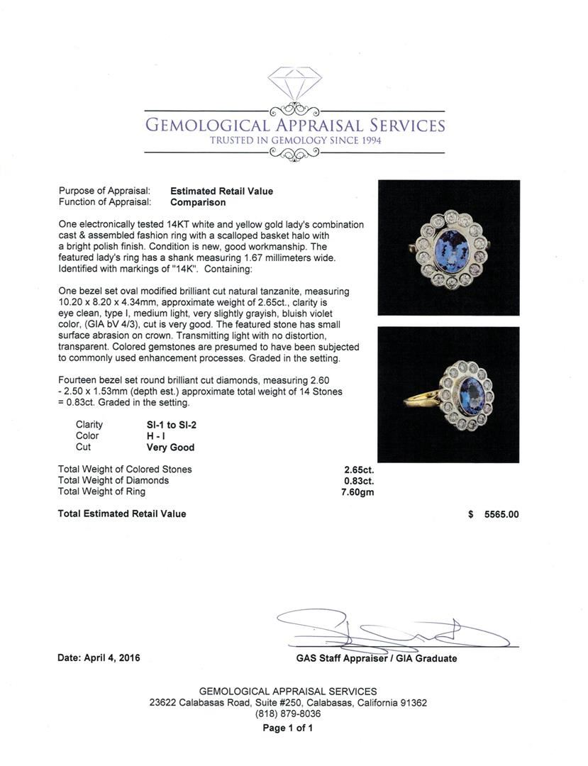 One electronically tested 14KT white and yellow gold lady's combination cast & assembled fashion ring with a scalloped basket halo with a bright polish finish. The featured lady's ring has a shank measuring 1.67 millimeters wide. Identified with markings of "14K". Condition is new, good workmanship. Containing: One bezel set oval modified brilliant cut natural tanzanite, measuring 10.20 x 8.20 x 4.34mm, approximate weight of 2.65ct., clarity is eye clean, type I, medium light, very slightly grayish, bluish violet color, (GIA bV 4/3), cut is very good. The featured stone has small surface abrasion on crown. Transmitting light with no distortion, transparent. Colored gemstones are presumed to have been subjected to commonly used enhancement processes. Graded in the setting. Fourteen bezel set round brilliant cut diamonds, measuring 2.60 - 2.50 x 1.53mm (depth est.) approximate total weight of 14 Stones = 0.83ct. Graded in the setting. Clarity: SI-1 to SI-2 . Color: H - I. Cut Very Good. Total Weight of Colored Stones 2.65ct.. Total Weight of Diamonds 0.83ct.. Total Weight of Ring 7.60gm. GAS Appraised at $5,565.00.