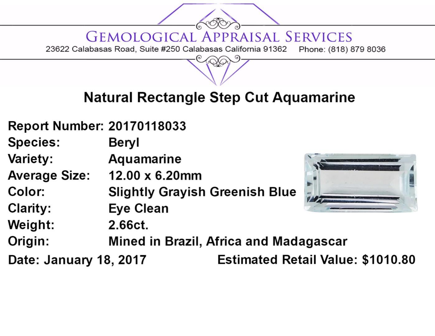 One natural rectangle step cut aquamarine with an exact weight of 2.66ct., clarity is eye clean, slightly grayish greenish blue. Gemological Appraisals Services estimates the retail value at $1010.8 GAS Appraised.