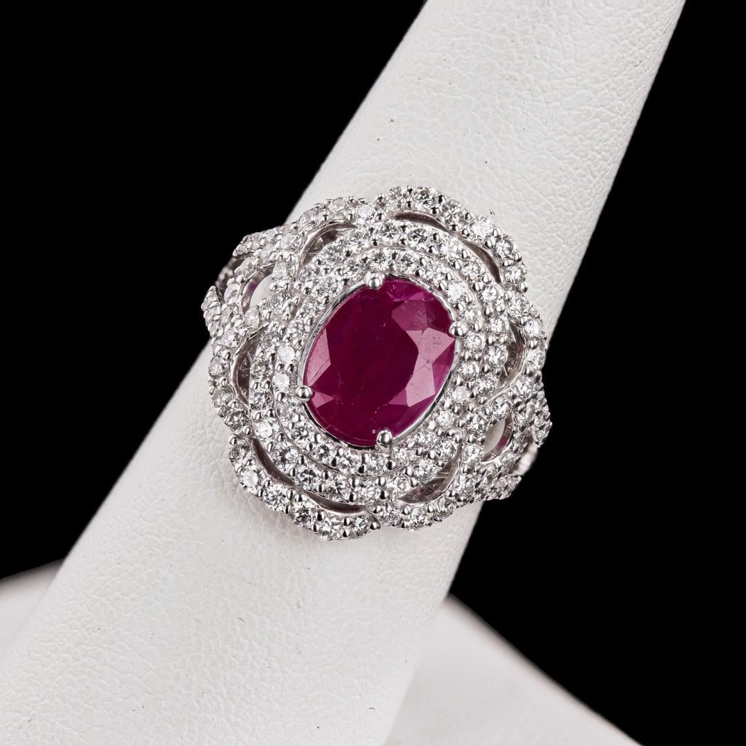 One polished, stamped, and tested platinum ring marked Aaron Gottlieb. The ring is mounted with: 1 genuine GIA certified Burmese Ruby center stone weighing 2.66 carats, and 102 genuine round diamonds weighing approximately 1.28 carats. This item weighs 9.4 grams, condition is new, excellent workmanship. #MAIN GEMSTONE# GIA Report No.: 2231055881 Species: Natural Corundum Variety: Ruby Origin: Burma (Myanmar) Shape: Oval Cutting Style: Brilliant Cut Crown Step Cut Pavilion Measurements: 8.90 x 7.08 x 4.67mm Weight: 2.66 carats Color: Purplish Red Transparency: Translucent Treatment: Heat with Residues Refractive Index: 1.762 - 1.770 DR Birefringence: 0.008 - 0.010 Hardness: 9 #ADJACENT GEMSTONES ON RING# Identity: Natural Diamond Shape: Round Cutting Style: Brilliant Cut Quantity: 102 Diamonds Measurements: 1.2 - 1.5mm Total Weight 1.28 carats Clarity Grade: VS2 - SI1 Color Grade: F - G Refractive Index: 2.417 Hardness: 10 RUBY WEIGHT: 2.66 ct TOTAL DIAMOND WEIGHT: 1.28 cts WEIGHT OF ITEM: 9.4 grams METAL: Platinum Size: 6.5