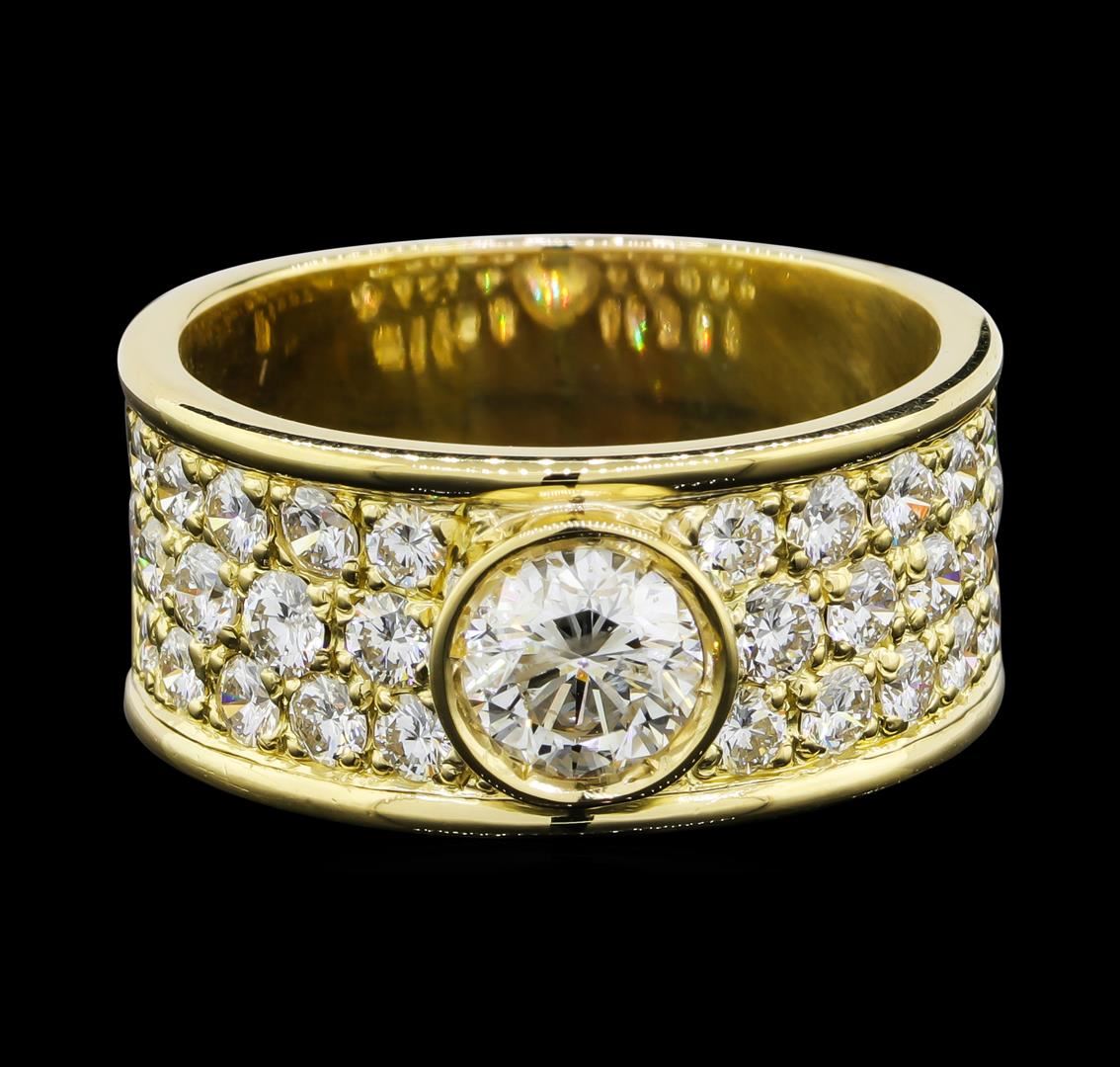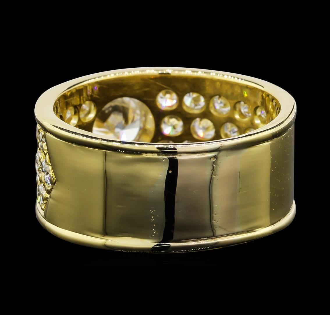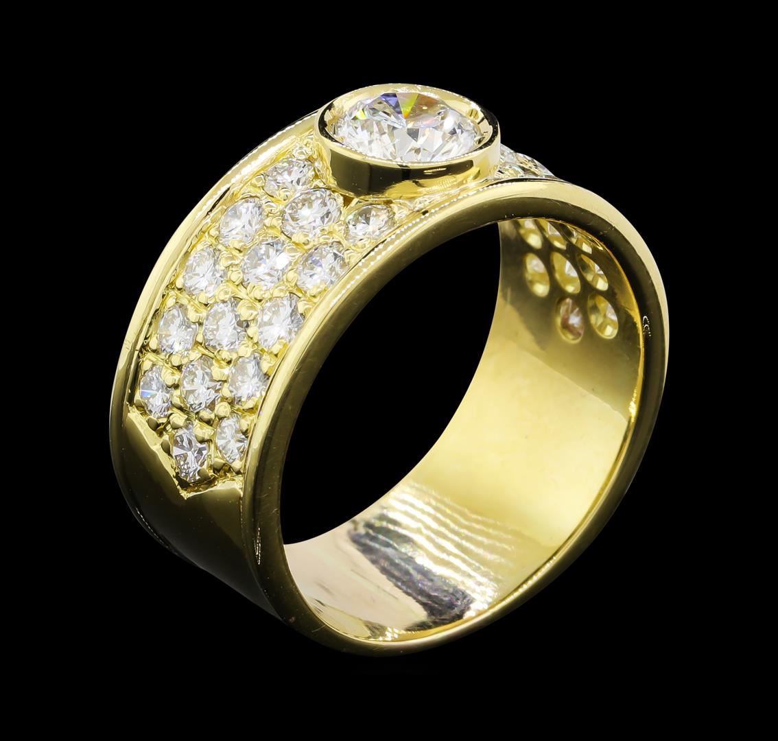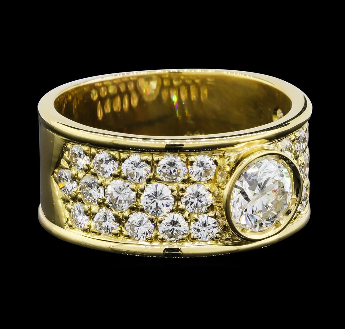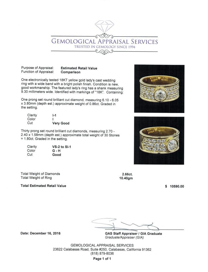 One electronically tested 18KT yellow gold lady's cast wedding ring with a wide band with a bright polish finish. The featured lady's ring has a shank measuring 9.30 millimeters wide. Identified with markings of '18K'. Condition is new, good workmanship. Containing: One prong set round brilliant cut diamond, measuring 6.10 - 6.05 x 3.80mm (depth est.) approximate weight of 0.86ct. Graded in the setting. Clarity I-1. Color: I Cut Very Good Thirty prong set round brilliant cut diamonds, measuring 2.70 - 2.40 x 1.58mm (depth est.) approximate total weight of 30 Stones = 1.80ct. Graded in the setting. Clarity VS-2 to SI-1. Color: G - H Cut Good. Total Weight of Diamonds 2.66ct.. Total Weight of Ring 10.40gm. GAS Appraised at $10,590.00.