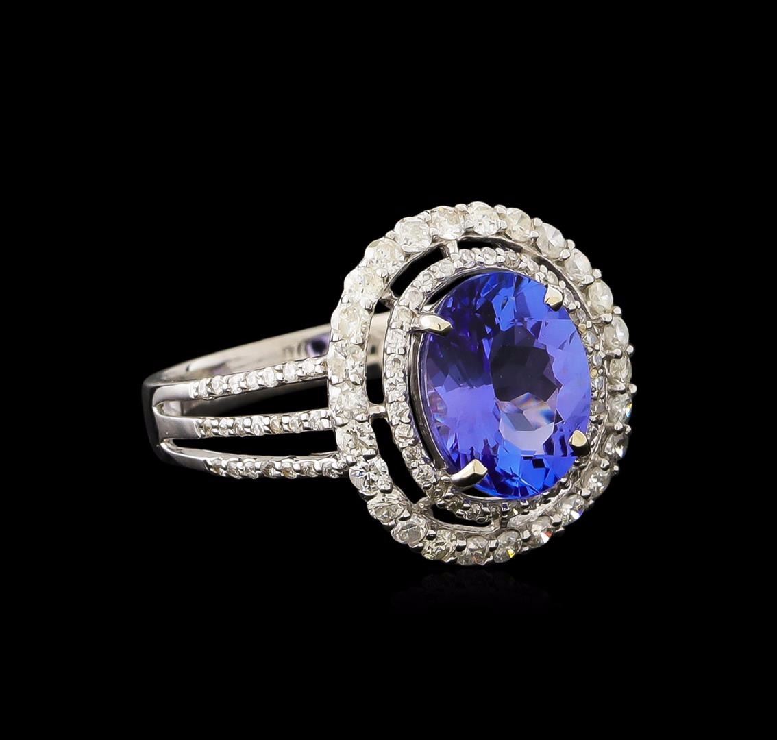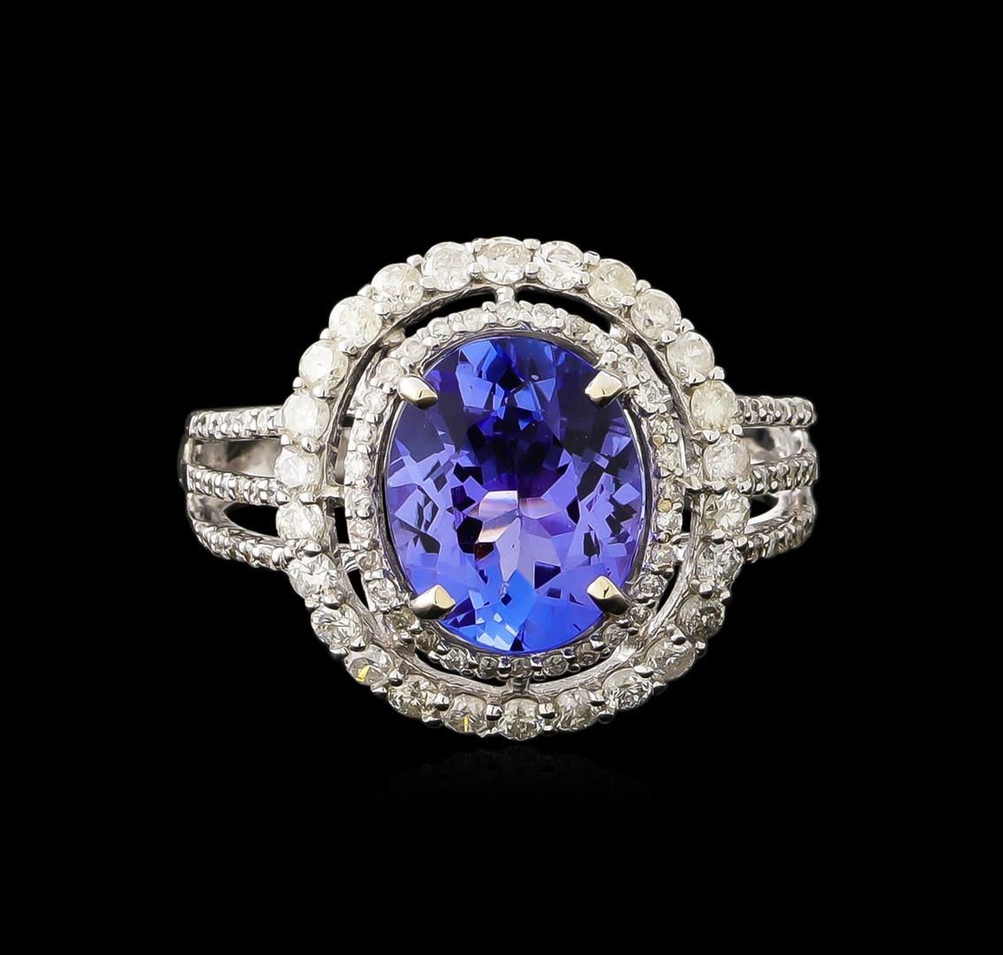 One electronically tested 14KT white gold ladies cast tanzanite and diamond ring with a bright polish finish. The featured tanzanite is set within tiered diamond bezels supported by diamond set three-way split shoulders, completed by a two and one-half millimeter wide band. Trademark is Orianne. Identified with markings of "14K". Condition is new, good workmanship. Containing: One prong set oval mixed cut natural tanzanite, measuring 9.95 x 8.05 x 4.55mm, approximate weight of 2.66ct., clarity is eye clean, type I, medium dark, very slightly grayish, bluish violet color, (GIA bV 6/3), cut is good. Transmitting light with no distortion, transparent. Graded in the setting. Tanzanite is a very rare gemstone that is only found in the country of Tanzania. Originally discovered in 1967. Tiffany & Company, named the stone Tanzanite. It is found in the Usumburu Mountains that border the Umba Valley of northern Tanzania. Tanzanite occurs in gray, brown, violet, blue, reddish-purple, & green. The gem is interesting because of its exceptional pleochroism. Rotated in different directions a tanzanite will exhibit multiple changes of color. Tanzanite has a low tolerance to ultrasonic cleaning, and should not be cleaned using this method. One Hundred prong set round brilliant cut diamonds approximate total weight of 100 Stones = 0.77ct. Graded in the setting. Clarity: I-1 to I-3. Color: G - I. Total Weight of Colored Stones 2.66ct. Total Weight of Diamonds 0.77ct. Total Weight of Ring 3.62gm. AIG Appraised at $7,950.00.