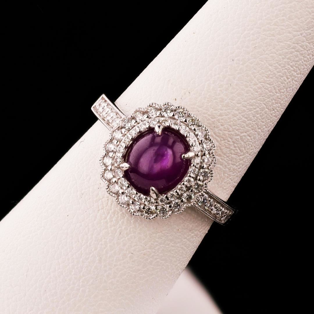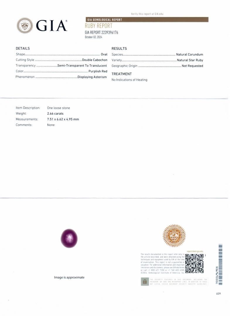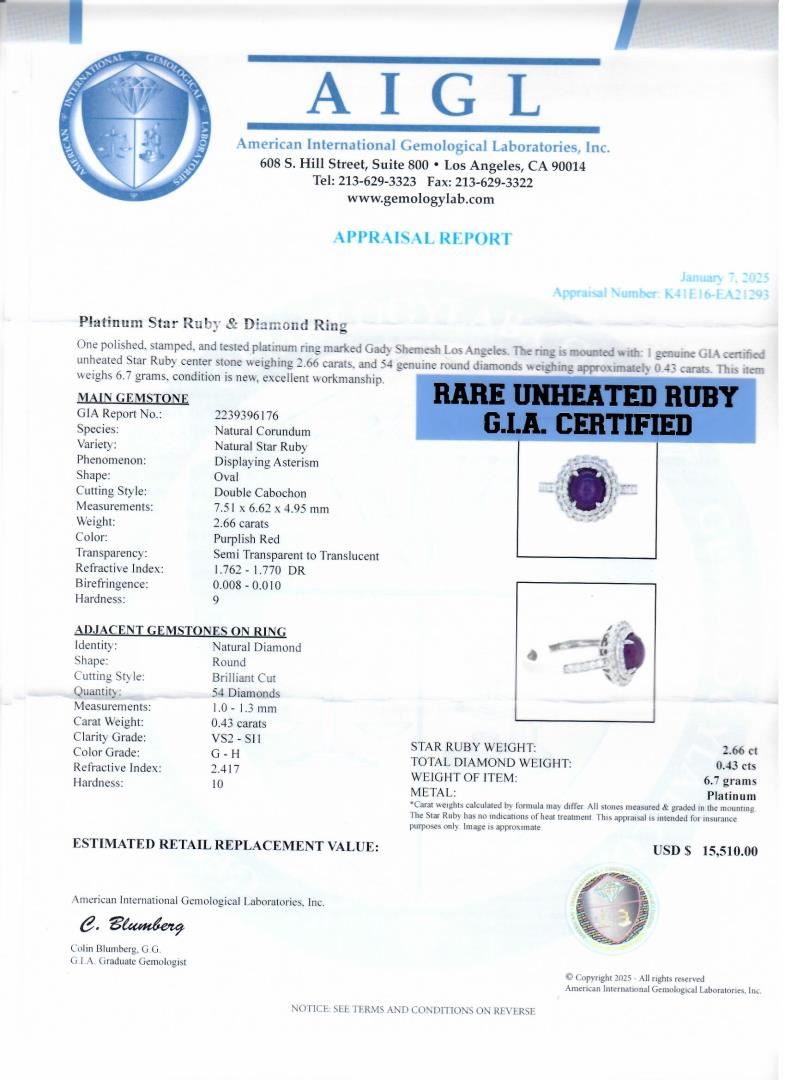 One polished, stamped, and tested platinum ring marked Gady Shemesh Los Angeles. The ring is mounted with: 1 genuine GIA certified unheated Star Ruby center stone weighing 2.66 carats. and 54 genuine round diamonds weighing approximately 0.43 carats. This item weighs 6.7 grams, condition is new, excellent workmanship. #MAIN GEMSTONE# GIA Report No.: 2239396176 Species: Natural Corundum Variety: Natural Star Ruby Phenomenon: Displaying Asterism Shape: Oval Cutting Style: Double Cabochon Measurements: 7.51 x 6.62 x 4.95mm Weight: 2.66 carats Color: Purplish Red Transparency: Semi Transparent to Translucent Refractive Index: 1.762 - 1.770 DR Birefringence: 0.008 - 0.010 Hardness: 9 #ADJACENT GEMSTONES ON RING# Identity: Natural Diamond Shape: Round Cutting Style: Brilliant Cut Quantity: 54 Diamonds Measurements: 1.0 - 1.3mm Carat Weight: 0.43 carats Clarity Grade: VS2-SI1 Color Grade: G-H Refractive Index: 2.417 Hardness: 10 #STAR RUBY WEIGHT: 2.66 ct TOTAL DIAMOND WEIGHT: 0.43 cts WEIGHT OF ITEM: 6.7 grams METAL: Platinum Size: 7