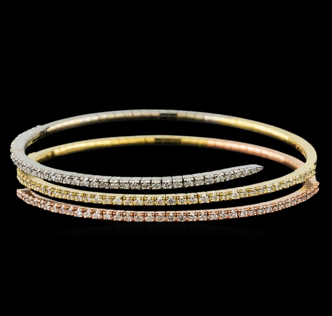 One electronically tested 14KT yellow, white, and rose gold lady's combination cast & assembled fashion bracelet with a bright polish finish. The featured lady's bracelet has a circumference of approximately 7 inches. Identified with markings of "K14". Condition is new, good workmanship. Containing: One Hundred Twenty-Six prong set round brilliant cut diamonds, measuring 1.80 - 1.70 x 1.09mm (depth est.) approximate total weight of 126 Stones = 2.63ct. Graded in the setting. Clarity: SI-1 to SI-2. Color: G - I. Cut Good Four prong set round brilliant cut diamonds, measuring 1.40 - 1.30 x 0.84mm (depth est.) approximate total weight of 4 Stones = 0.04ct. Graded in the setting. Clarity: SI-1 to I-1. Color: H - I. Cut Good. Total Weight of Diamonds 2.67ct. Total Weight of Bracelet 22.80gm. GAS Appraised at $8,810.00.