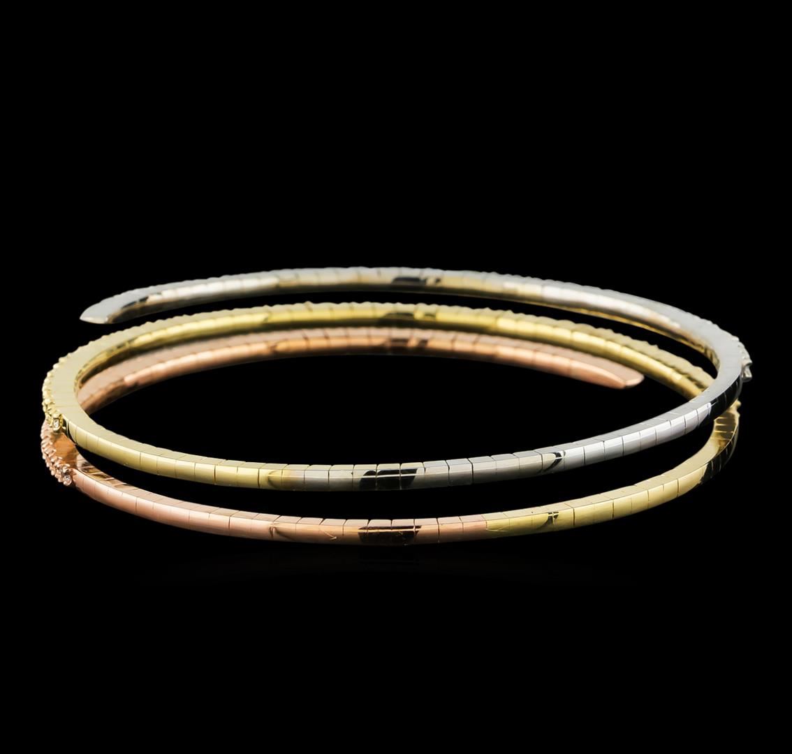 One electronically tested 14KT yellow, white, and rose gold lady's combination cast & assembled fashion bracelet with a bright polish finish. The featured lady's bracelet has a circumference of approximately 7 inches. Identified with markings of "K14". Condition is new, good workmanship. Containing: One Hundred Twenty-Six prong set round brilliant cut diamonds, measuring 1.80 - 1.70 x 1.09mm (depth est.) approximate total weight of 126 Stones = 2.63ct. Graded in the setting. Clarity: SI-1 to SI-2. Color: G - I. Cut Good Four prong set round brilliant cut diamonds, measuring 1.40 - 1.30 x 0.84mm (depth est.) approximate total weight of 4 Stones = 0.04ct. Graded in the setting. Clarity: SI-1 to I-1. Color: H - I. Cut Good. Total Weight of Diamonds 2.67ct. Total Weight of Bracelet 22.80gm. GAS Appraised at $8,810.00.