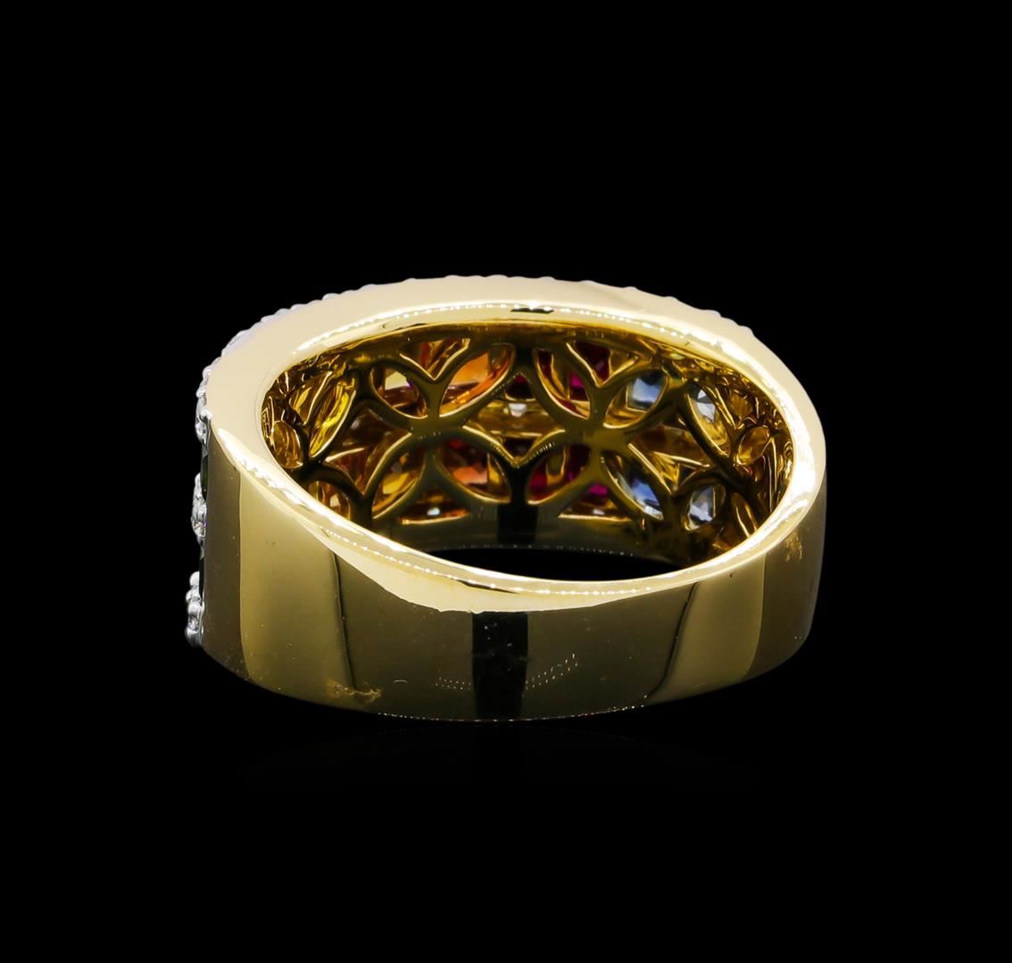 One electronically tested 14KT yellow gold lady's cast fashion ring with a five row wide band with a bright polish finish. The featured lady's ring has a shank measuring 4.97 millimeters in width. Identified with markings of "14K". Condition is new, good workmanship. Containing: Twenty-two channel set princess modified brilliant cut natural multi-color sapphires, measuring 2.60 x 2.50 x 1.88mm, (depth est.) approximate total weight of 2.67ct., clarity is eye clean (Gem Dialogue The hue ranges from blue to red to orange to yellow to green.), cut is very good. Transmitting light with no distortion, transparent. Colored gemstones are presumed to have been subjected to commonly used enhancement processes. Graded in the setting. Fifty-One prong set round brilliant cut diamonds, measuring 1.45 - 1.35 x 0.87mm (depth est.) approximate total weight of 51 Stones = 0.53ct. Graded in the setting. Clarity: VS-2 to SI-1. Color: G - Very Good. Total Weight of Colored Stones 2.67ct. Total Weight of Diamonds 0.53ct. Total Weight of Ring 7.20gm. GAS Appraised at $5,040.00.