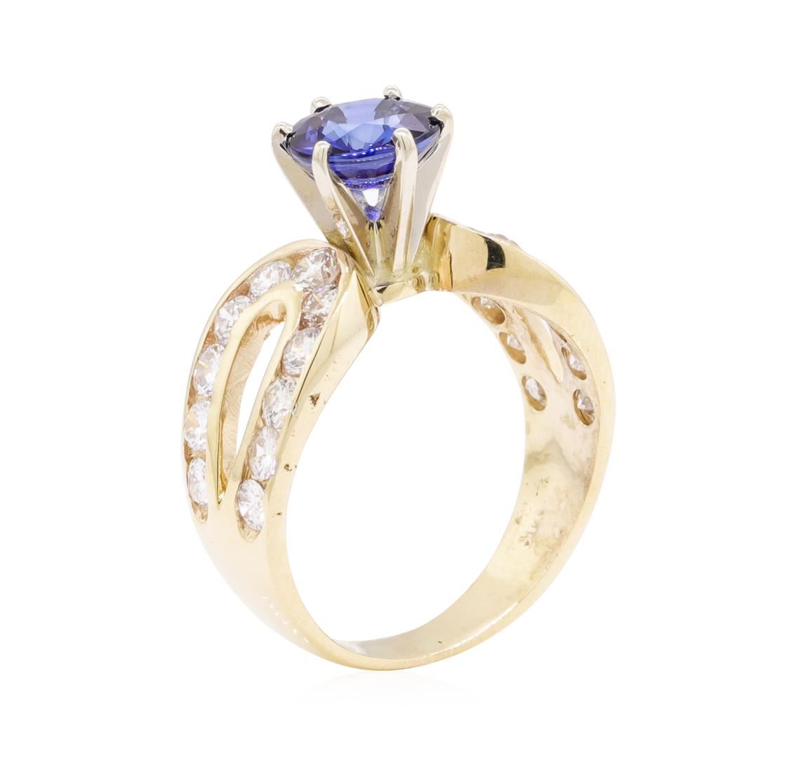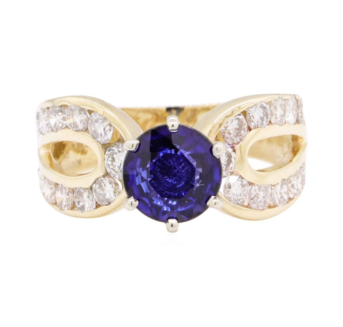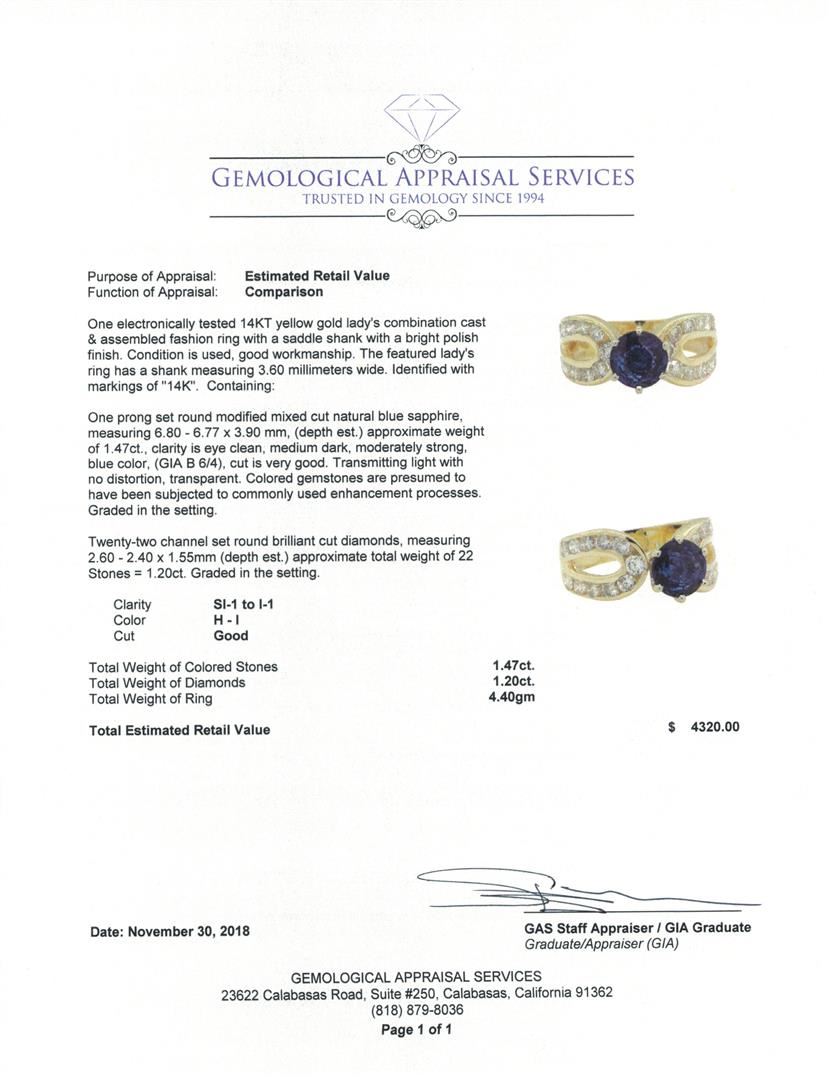 One electronically tested 14KT yellow gold lady's combination cast & assembled fashion ring with a saddle shank with a bright polish finish. The featured lady's ring has a shank measuring 3.60 millimeters wide. Identified with markings of '14K'. Condition is used, good workmanship. Containing: One prong set round modified mixed cut natural blue sapphire, measuring 6.80 - 6.77 x 3.90 mm, (depth est.) approximate weight of 1.47ct., clarity is eye clean, medium dark, moderately strong, blue color, (GIA B 6/4), cut is very good. Transmitting light with no distortion, transparent. Colored gemstones are presumed to have been subjected to commonly used enhancement processes. Graded in the setting. Twenty-Two channel set round brilliant cut diamonds, measuring 2.60 - 2.40 x 1.55mm (depth est.) approximate total weight of 22 Stones = 1.20ct. Graded in the setting. Color H - I Clarity SI-1 to I-1 Cut Good. Total Weight of Colored Stones 1.47ct.. Total Weight of Diamonds 1.20ct.. Total Weight of Ring 4.40gm GAS Appraised at $4320.00. GAS Appraised at $4,320.00.