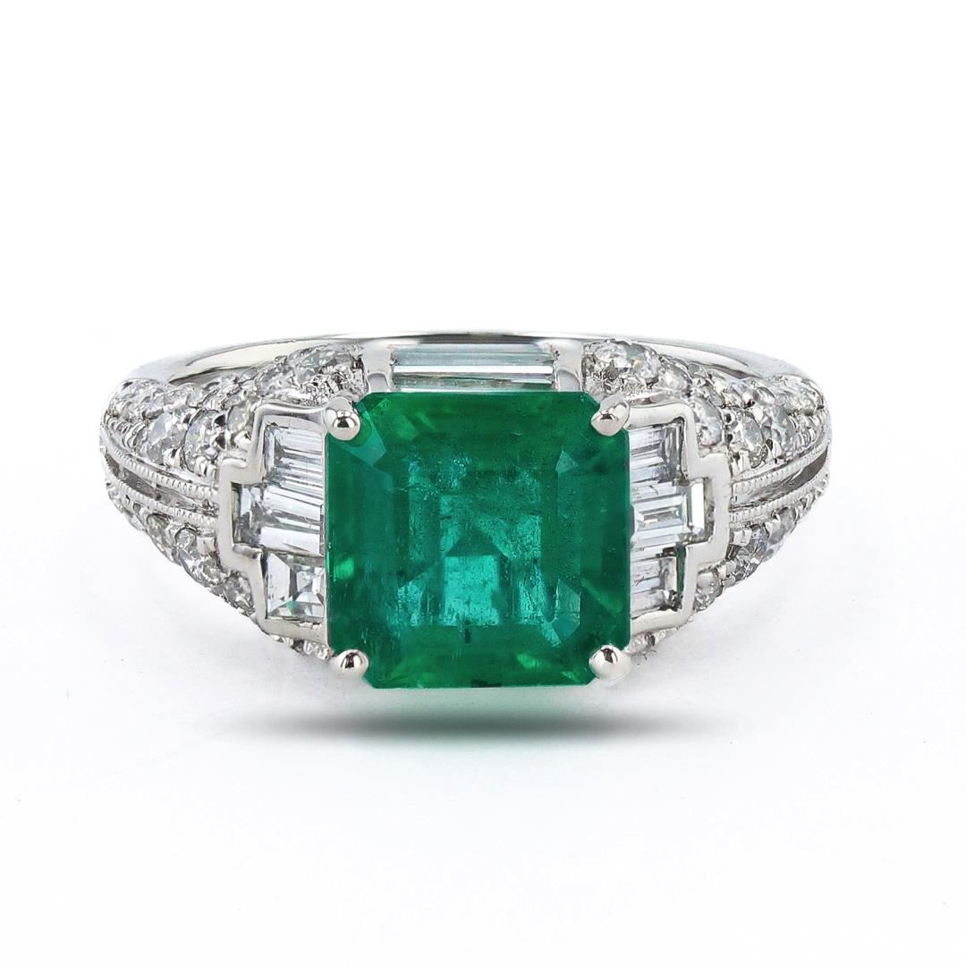 One polished, stamped. and tested platinum ring marked Orianne. The ring is mounted with: 1 genuine emerald center stone weighing approximately 2.68 carat, and 76 genuine faceted diamonds weighing approximately 1.97 carats. This item weighs 6.5 grams, condition is new, excellent workmanship. #MAIN GEMSTONE# Species: Natural Beryl; Variety: Emerald; Shape: Octagonal; Cutting Style: Step Cut; Measurements: 8.3 x 8.3mm; Weight: 2.68 carat; Color: Green; Cut Grade: Very Good; Refractive Index: 1.564 - 1.595 DR; Birefringence: 0.005 to 0.009; Hardness: 7.5 - 8 #ADJACENT GEMSTONES ON RING# Identity: Natural Diamond; Shape & Cutting Style: Baguette / Round Brilliant; Quantity: 76 Diamonds; Measurements: 2.0 - 4.5mm (16 baguette), 1.0 - 2.0mm (60 round); Total Weight: 1.97 carats; Color Grade: G-H; Clarity Grade: VS1-SI1; Refractive Index: 2.417; Hardness: 10; EMERALD WEIGHT: 2.68 ct; TOTAL DIAMOND WEIGHT: 1.97 cts; WEIGHT OF ITEM: 6.5 grams; METAL: Platinum #Size: 6 1/4