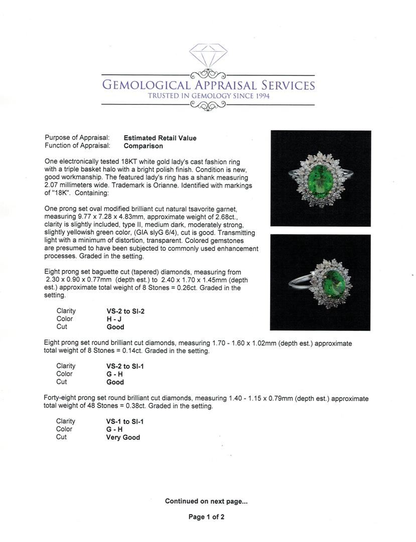 One electronically tested 18KT white gold lady's cast fashion ring with a triple basket halo with a bright polish finish. The featured lady's ring has a shank measuring 2.07 millimeters wide. Trademark is Orianne. Identified with markings of "18K". Condition is new, good workmanship. Containing: One prong set oval modified brilliant cut natural tsavorite garnet, measuring 9.77 x 7.28 x 4.83mm, approximate weight of 2.68ct., clarity is slightly included, type II, medium dark, moderately strong, slightly yellowish green color, (GIA slyG 6/4), cut is good. Transmitting light with a minimum of distortion, transparent. Colored gemstones are presumed to have been subjected to commonly used enhancement processes. Graded in the setting. Eight prong set baguette cut (tapered) diamonds, measuring from 2.30 x 0.90 x 0.77mm (depth est.) to 2.40 x 1.70 x 1.45mm (depth est.) approximate total weight of 8 Stones = 0.26ct. Graded in the setting. Clarity: VS-2 to SI-2. Color: H - Good Eight prong set round brilliant cut diamonds, measuring 1.70 - 1.60 x 1.02mm (depth est.) approximate total weight of 8 Stones = 0.14ct. Graded in the setting. Clarity: VS-2 to SI-1. Color: G - Good Forty-Eight prong set round brilliant cut diamonds, measuring 1.40 - 1.15 x 0.79mm (depth est.) approximate total weight of 48 Stones = 0.38ct. Graded in the setting. Clarity: VS-1 to SI-1. Color: G - Very Good. Total Weight of Colored Stones 2.68ct. Total Weight of Diamonds 0.78ct. Total Weight of Ring 4.00gm. GAS Appraised at $10,010.00.