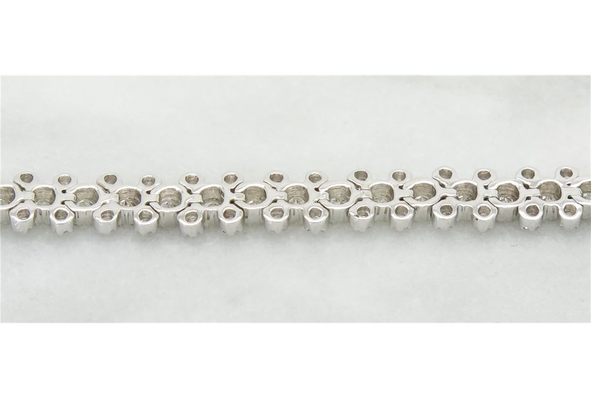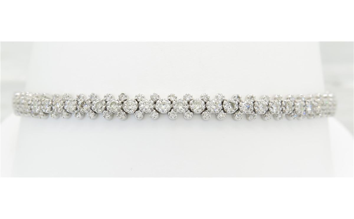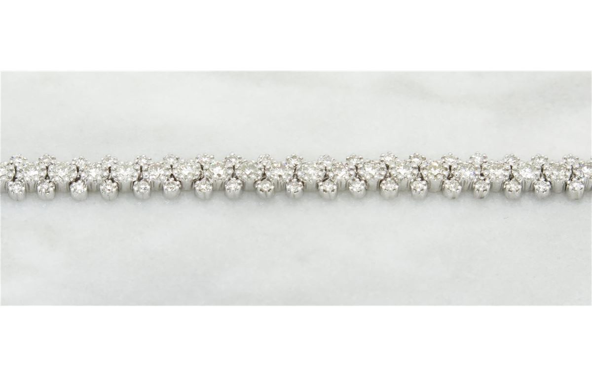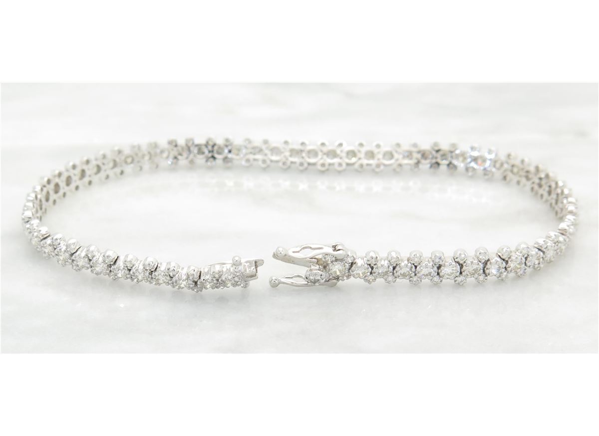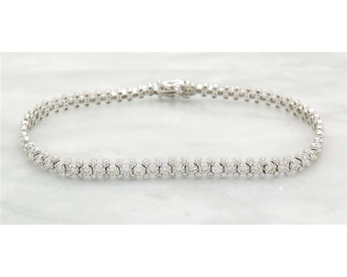 One tested 18K white gold diamond bracelet. Containing: 192 Round Brilliant Cut Diamonds. Clarity: I-VS, Color: G-I. Approximate total diamond weight: 2.68CTW. All diamonds are graded in the mounting unless otherwise stated. Weight of bracelet: 8.9 grams, Size: 7" long.