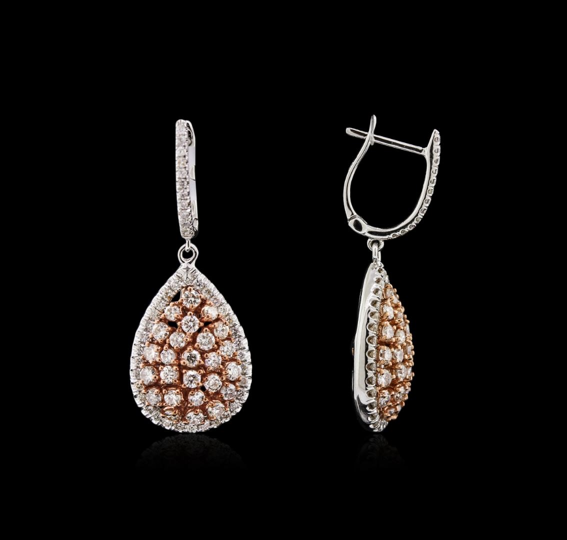 One pair electronically tested 14KT rose and white gold lady's combination cast & assembled dangle earring with hinged, snap locking posts with a bright polish finish. Identified with markings of "14K". Condition is new, good workmanship. Containing: Fifty prong set round brilliant cut diamonds, measuring 2.40 - 2.20 x 1.38mm (depth est.) approximate total weight of 50 Stones = 2.20ct. Graded in the setting. Clarity SI-1 to SI-2 Color H - Good Eighty-Eight split prong set round brilliant cut diamonds, measuring 1.20 - 1.10 x 0.69mm (depth est.) approximate total weight of 88 Stones = 0.48ct. Graded in the setting. Clarity SI-1 to I-1 Color H - I. Cut Good Total Weight of Diamonds 2.68ct. Total Weight of Earring 8.90gm GAS Appraised at $9,035.00.