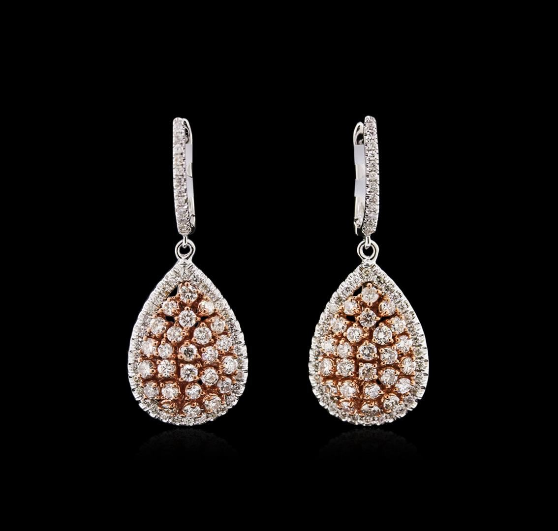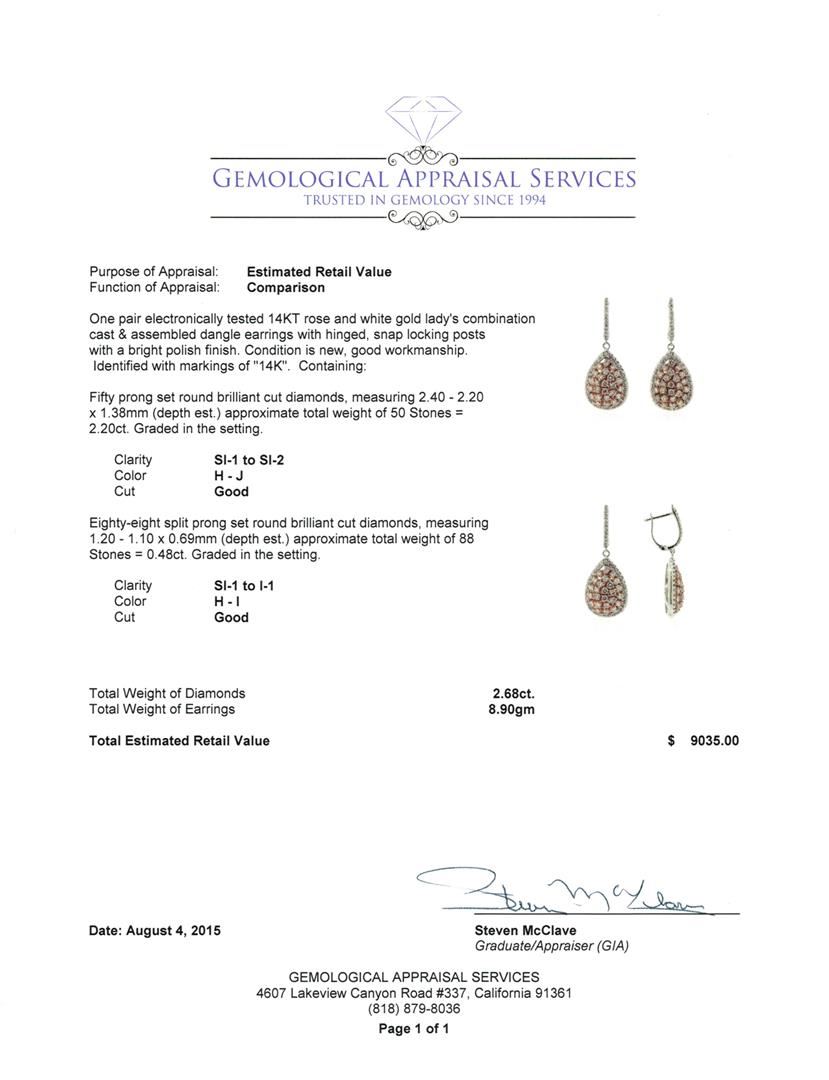 One pair electronically tested 14KT rose and white gold lady's combination cast & assembled dangle earring with hinged, snap locking posts with a bright polish finish. Identified with markings of "14K". Condition is new, good workmanship. Containing: Fifty prong set round brilliant cut diamonds, measuring 2.40 - 2.20 x 1.38mm (depth est.) approximate total weight of 50 Stones = 2.20ct. Graded in the setting. Clarity SI-1 to SI-2 Color H - Good Eighty-Eight split prong set round brilliant cut diamonds, measuring 1.20 - 1.10 x 0.69mm (depth est.) approximate total weight of 88 Stones = 0.48ct. Graded in the setting. Clarity SI-1 to I-1 Color H - I. Cut Good Total Weight of Diamonds 2.68ct. Total Weight of Earring 8.90gm GAS Appraised at $9,035.00.