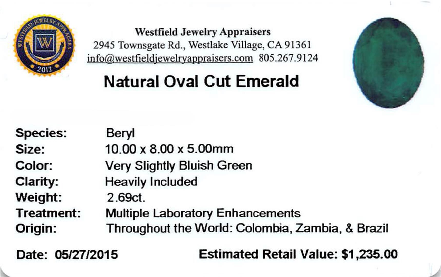 One oval cut natural emerald, measuring 10.00 x 8.00 x 5.00mm, approximate weight of 2.69ct., clarity is heavily included, type III, medium dark, very slightly grayish, very slightly bluish green color, (GIA vslbG 6/3), cut is good. Transmitting light somewhat diffusely, translucent, Naturally occurring internal & external characteristics are present, Indications of multiple laboratory enhancements, including high temperature heat treatment. Westfield Appraised.