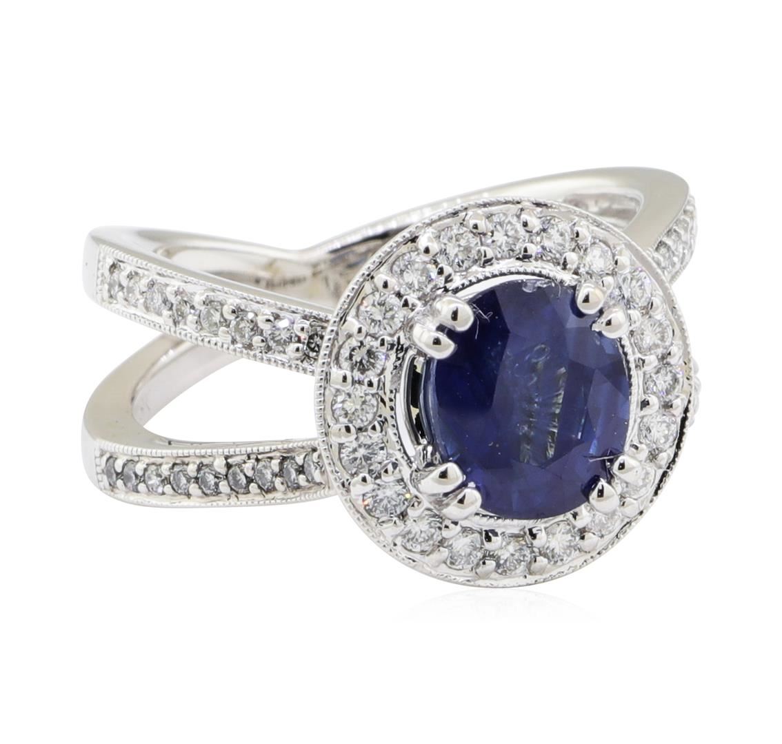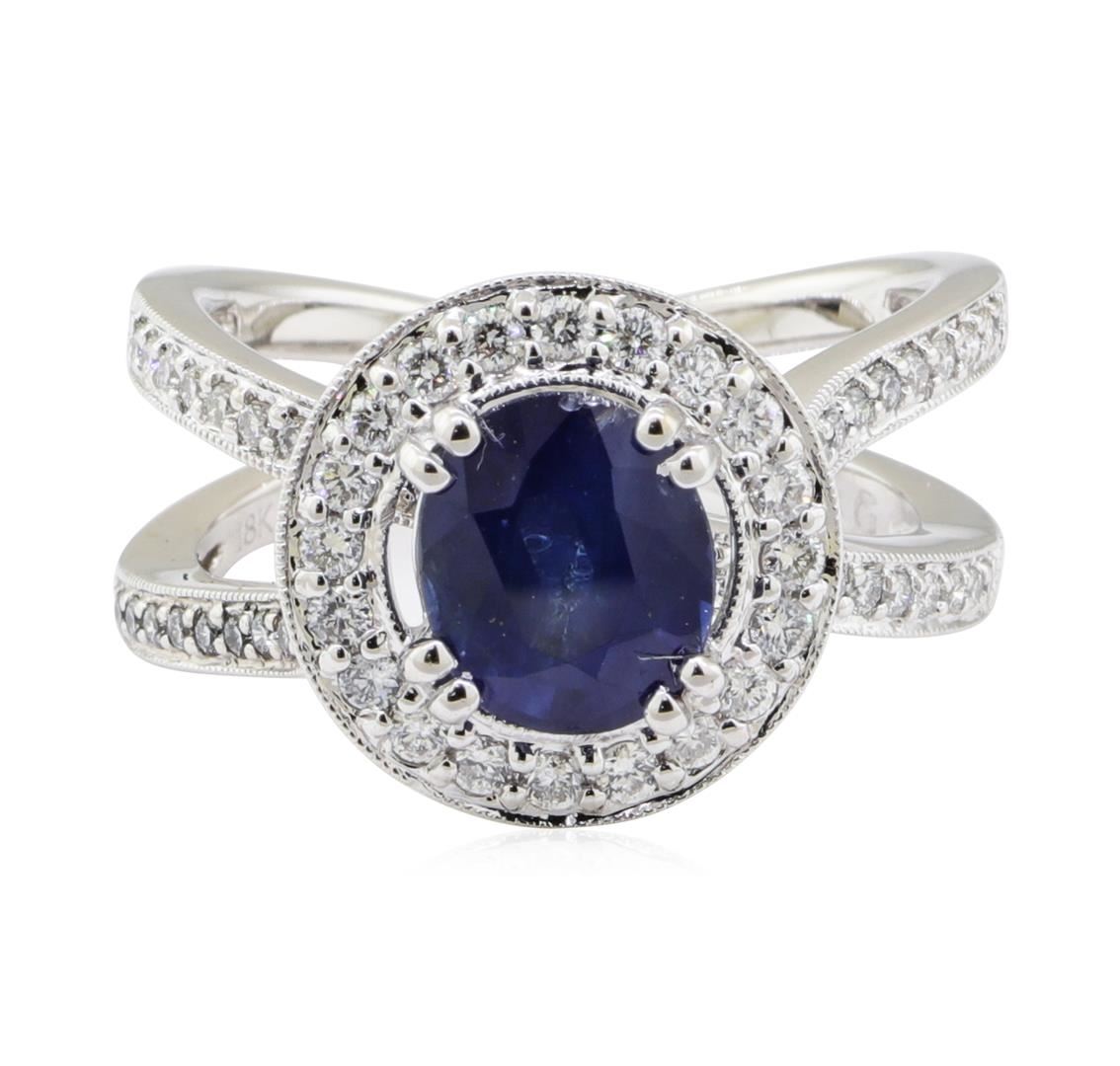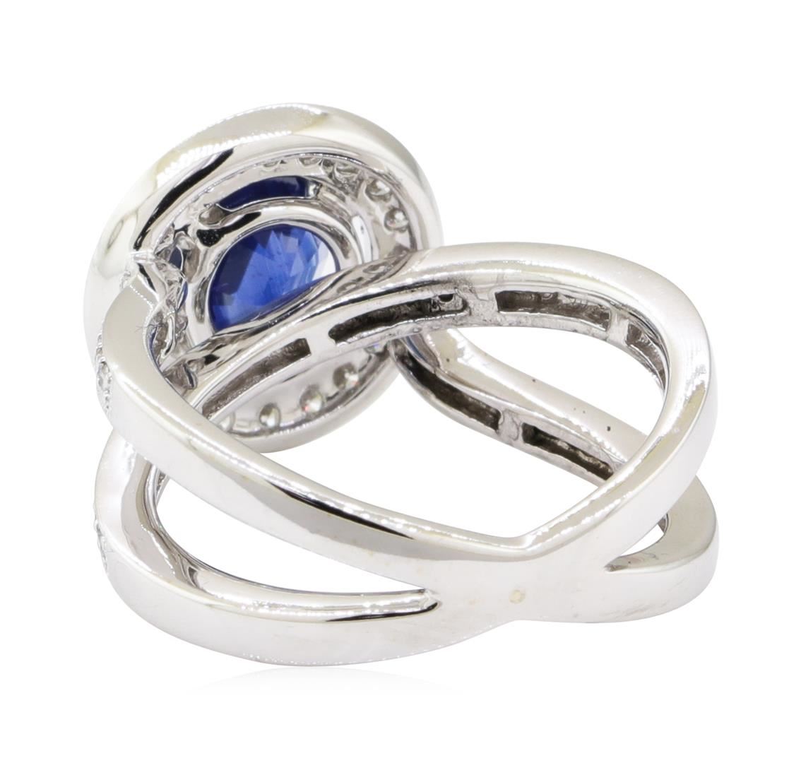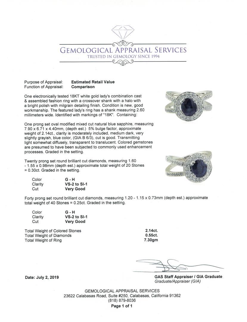 One electronically tested 18KT white gold lady's combination cast & assembled fashion ring with a crossover shank with a halo with a bright polish with milgrain detailing finish. The featured lady's ring has a shank measuring 2.60 millimeters wide. Identified with markings of '18K'. Condition is new, good workmanship. Containing: One prong set oval modified mixed cut natural blue sapphire, measuring 7.90 x 6.71 x 4.40mm, (depth est.) 5%. bulge factor, approximate weight of 2.14ct., clarity is moderately included, medium dark, very slightly grayish, blue color, (GIA B 6/3), cut is good. Transmitting light somewhat diffusely, transparent to translucent. Colored gemstones are presumed to have been subjected to commonly used enhancement processes. Graded in the setting. Twenty prong set round brilliant cut diamonds, measuring 1.60 - 1.55 x 0.98mm (depth est.) approximate total weight of 20 Stones = 0.30ct. Graded in the setting. Color G - H Clarity VS-2 to SI-1 Cut Very Good Forty prong set round brilliant cut diamonds, measuring 1.20 - 1.15 x 0.73mm (depth est.) approximate total weight of 40 Stones = 0.25ct. Graded in the setting. Color G - H Clarity VS-2 to SI-1 Cut Very Good. Total Weight of Colored Stones 2.14ct.. Total Weight of Diamonds 0.55ct.. Total Weight of Ring 7.30gm GAS Appraised at $5405.00. GAS Appraised at $5,405.00.