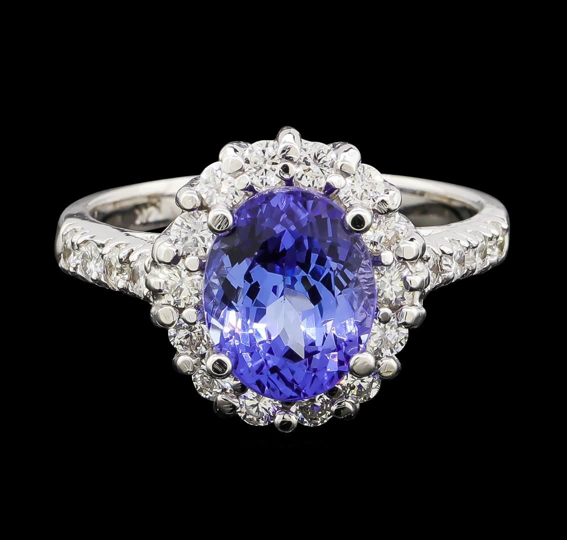 One electronically tested 14KT white gold lady's cast fashion ring with a basket halo with a bright polish finish. The featured lady's ring has a shank measuring 2.15 millimeters wide. Identified with markings of '14K'. Condition is new, good workmanship. Containing: One prong set oval modified brilliant cut natural tanzanite, measuring 9.40 x 7.50 x 5.47mm, (depth est.) approximate weight of 2.69ct., clarity is eye clean, medium, moderately strong, violetish blue color, (GIA vB 5/4), cut is very good. Transmitting light with no distortion, transparent. Colored gemstones are presumed to have been subjected to commonly used enhancement processes. Graded in the setting. Fourteen prong set round brilliant cut diamonds, measuring 2.10 - 2.00 x 1.25mm (depth est.) approximate total weight of 14 Stones = 0.45ct. Graded in the setting. Clarity SI-1 to I-1. Color: G - H Cut Good Eight prong set round brilliant cut diamonds, measuring 1.90 - 1.85 x 1.17mm (depth est.) approximate total weight of 8 Stones = 0.20ct. Graded in the setting. Clarity SI-1 to I-1. Color: G - H Cut Good. Total Weight of Colored Stones 2.69ct.. Total Weight of Diamonds 0.65ct.. Total Weight of Ring 5.10gm. GAS Appraised at $6,120.00.