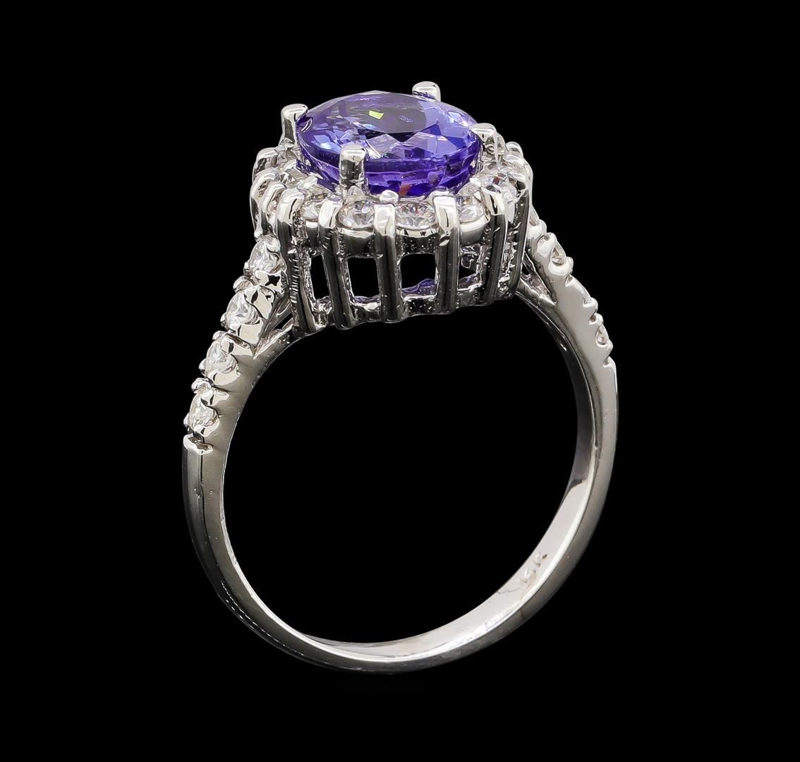 One electronically tested 14KT white gold lady's cast fashion ring with a basket halo with a bright polish finish. The featured lady's ring has a shank measuring 2.15 millimeters wide. Identified with markings of '14K'. Condition is new, good workmanship. Containing: One prong set oval modified brilliant cut natural tanzanite, measuring 9.40 x 7.50 x 5.47mm, (depth est.) approximate weight of 2.69ct., clarity is eye clean, medium, moderately strong, violetish blue color, (GIA vB 5/4), cut is very good. Transmitting light with no distortion, transparent. Colored gemstones are presumed to have been subjected to commonly used enhancement processes. Graded in the setting. Fourteen prong set round brilliant cut diamonds, measuring 2.10 - 2.00 x 1.25mm (depth est.) approximate total weight of 14 Stones = 0.45ct. Graded in the setting. Clarity SI-1 to I-1. Color: G - H Cut Good Eight prong set round brilliant cut diamonds, measuring 1.90 - 1.85 x 1.17mm (depth est.) approximate total weight of 8 Stones = 0.20ct. Graded in the setting. Clarity SI-1 to I-1. Color: G - H Cut Good. Total Weight of Colored Stones 2.69ct.. Total Weight of Diamonds 0.65ct.. Total Weight of Ring 5.10gm. GAS Appraised at $6,120.00.