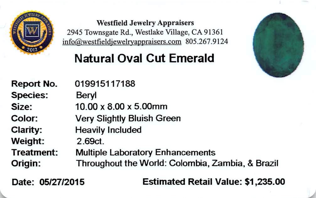One oval cut natural emerald, measuring 10.00 x 8.00 x 5.00mm, approximate weight of 2.69ct., clarity is heavily included, type III, medium dark, very slightly grayish, very slightly bluish green color, (GIA vslbG 6/3), cut is good. Transmitting light somewhat diffusely, translucent, Naturally occurring internal & external characteristics are present, Indications of multiple laboratory enhancements, including high temperature heat treatment. Westfield Appraised at $1,235.00.