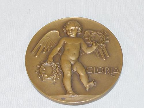2 7/8" ROUND BRONZE MEDAL "GLORIA" W/ CHERUB & "FAMA" W/ CICADA ON REVERSE BY CARL PAUL JENNEWEIN FOR THE SOCIETY OF MEDALISTS IN 1933 W/ BROCHURE-MEDALLIC ART CO. NY (SEVENTH ISSUE)