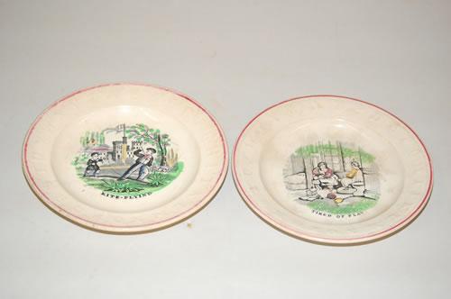 (2) 7" STAFFORDSHIRE TRANSFER CHILDS ABC PLATES W/ POLYCHROME DECORATIONS: (1) "KITE FLYING" MARKED J. & E. MEAKIN 23 & (1) "TIRED OF PLAY" MARKED 19-30-BOTH W/ ALPHABET BORDERS - HAIRLINES, CRAZING, STAIN