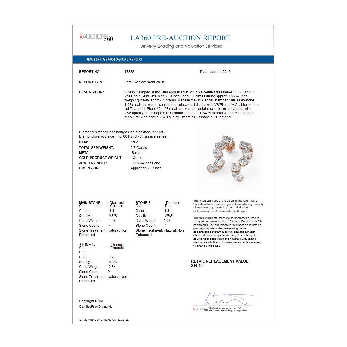 All sales are final, placing a bid is a legally binding obligation. All lots are sold as is, where is, with all the faults, imperfections, omissions and errors in the written description, estimates, appraisals, graphics and photography. USJL is not responsible for any errors or omissions in the description, graphics or photography provided or in the bidding software. Due diligence to verify the condition and description of a lot is the sole responsibility of the Bidder prior to placing any bid. Returns may only be made with the advance written authorization of USJL and are in USJL's sole discretion to approve. To request a return you must provide a written request fully explaining the basis for the return no later than 4 days after your receipt of the lot. Under no circumstances will any amounts other than the winning bid amount be refunded. A restocking charge of 19% of the full invoice amount may apply in USJL 's sole discretion. Any allowed returns must be received in exactly the same condition as when originally shipped to Buyer, or they will be returned to buyer at Buyer's cost. Any unauthorized returns will be refused. DELIVERY REFUSAL OF ITEMS SHIPPED BY US JEWELRY LIQUIDATION TO THE BIDDER CONSTITUTES AN UNAUTHORIZED RETURN IN DIRECT VIOLATION OF THESE GENERAL TERMS AND CONDITIONS.