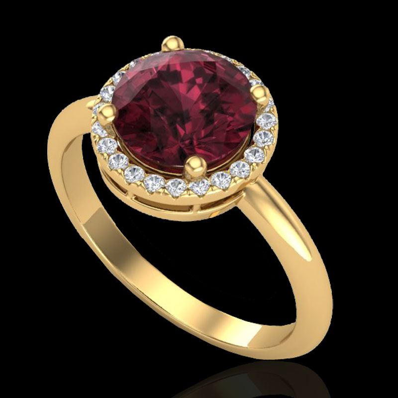 2.70 CTW Garnet & Micro Pave VS/SI Diamond Ring Designer Halo 18K Yellow Gold ---- Luxury Designer Brand Ring Appraised Retail Price at $3,900 ---- SKU Number US23213 18k Yellow gold Ring Size is 6.5, Ring measuring approx. 1/2"x1/2", weighing in total approx. 5.5 grams. Made in the USA and is stamped 18k, Main stone 2.50 carat total weight containing 1 pieces of Saturated purplish Red color with AAA quality Round shape cut Garnet , Stone #2 0.2 carat total weight containing 25 pieces of H-I color with VS/SI quality Round shape cut