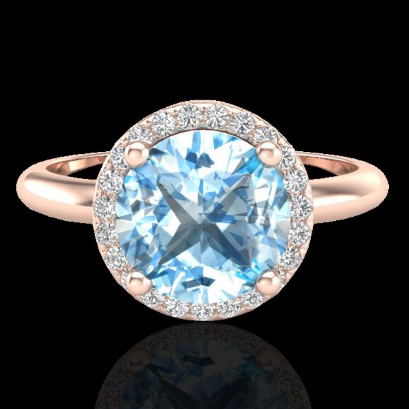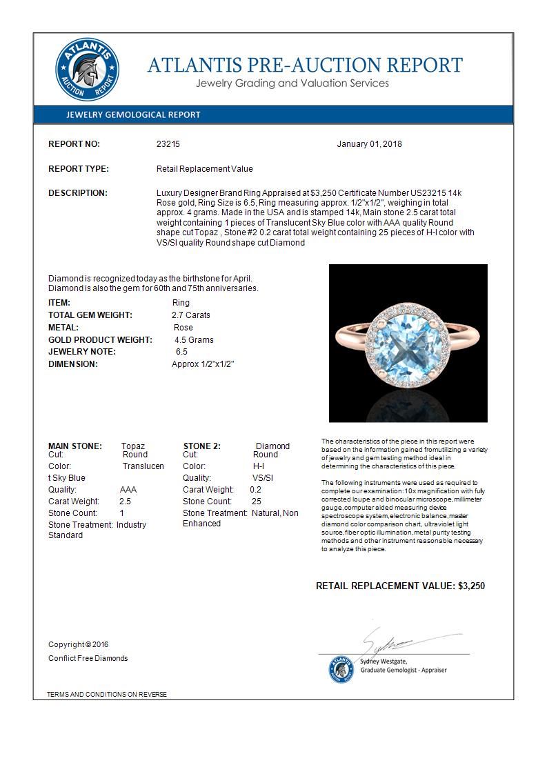 REF-45M6H -23215 ---- 2.70 CTW Sky Blue Topaz & Micro VS/SI Diamond Ring Designer Halo 14K Rose Gold ---- Luxury Designer Brand Ring Appraised at $3,250 Certificate Number US23215 14k Rose gold, Ring Size is 6.5, Ring measuring approx. 1/2"x1/2", weighing in total approx. 4 grams. Made in the USA and is stamped 14k, Main stone 2.5 carat total weight containing 1 pieces of Translucent Sky Blue color with AAA quality Round shape cut Topaz , Stone #2 0.2 carat total weight containing 25 pieces of H-I color with VS/SI quality Round shape cut Diamond