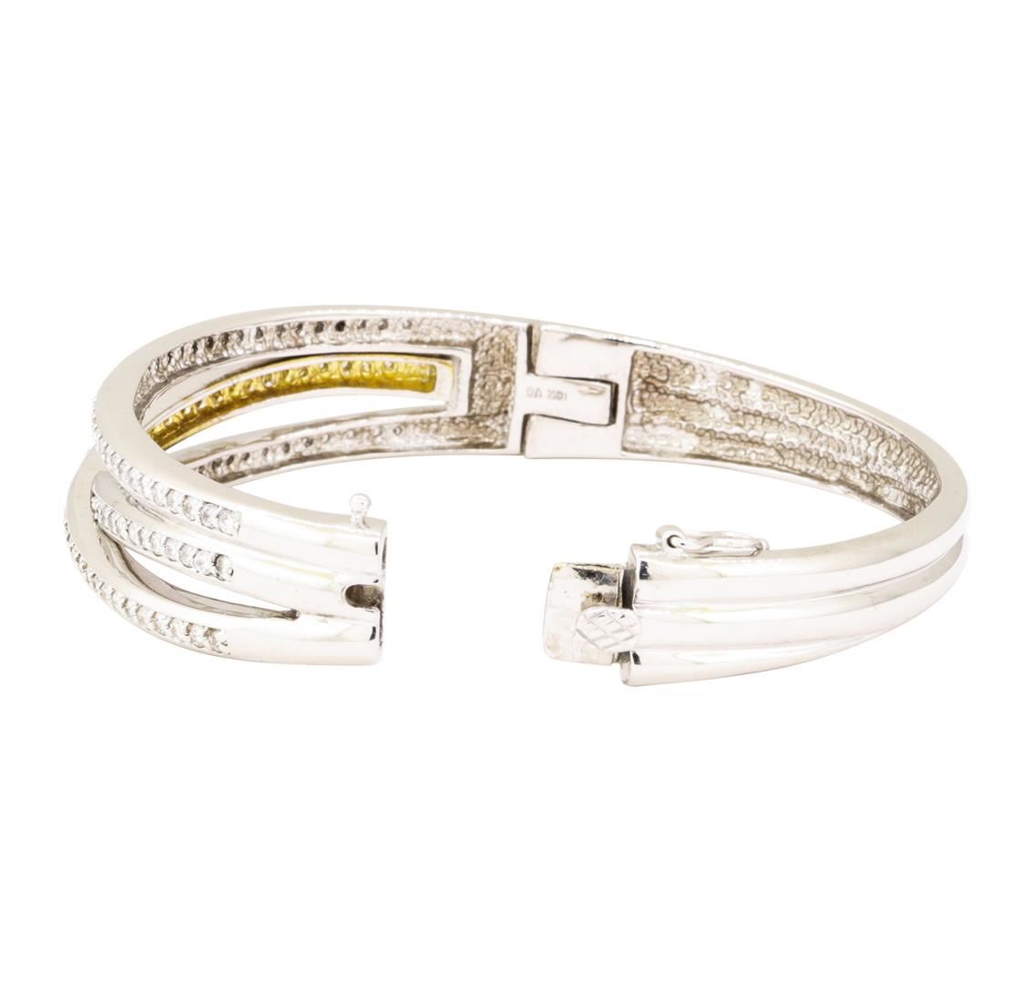 One electronically tested 18KT white and yellow gold lady's combination cast & assembled fashion bangle bracelet with a tongue clasp with foldover safety with a crossover motif with a bright polish finish. The featured lady's bracelet has a circumference of approximately six and a quarter inches. Identified with markings of '18K'. Condition is like new, good workmanship. Containing: One Hundred prong set round brilliant cut diamonds, measuring 2.00 - 1.80 x 1.18mm (depth est.) approximate total weight of 100 Stones = 2.70ct. Graded in the setting. Color H - I Clarity VS-2 to SI-1 Cut Very Good. Total Weight of Diamonds 2.70ct.. Total Weight of Bangle Bracelet 51.30gm GAS Appraised at $15660.00. GAS Appraised.