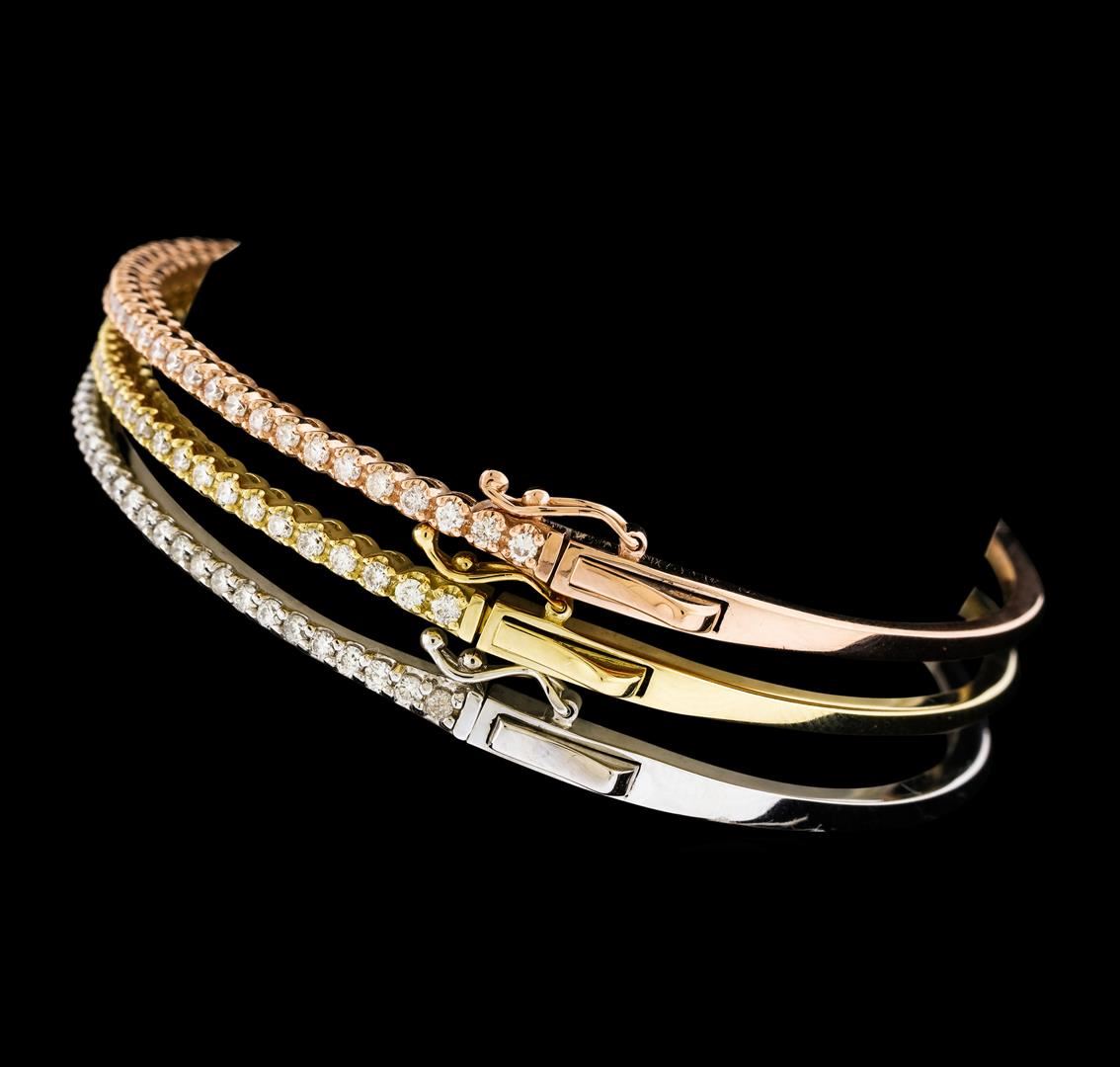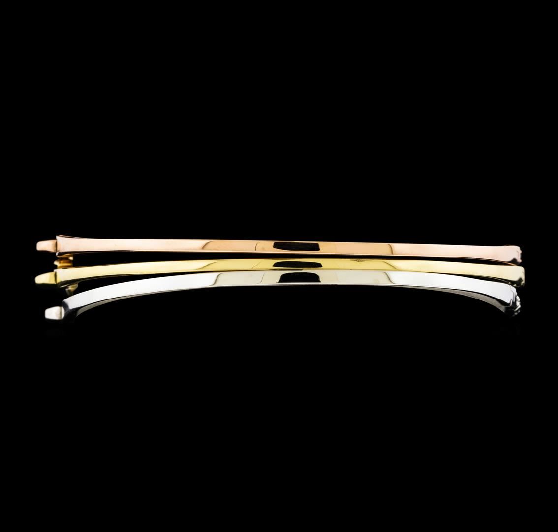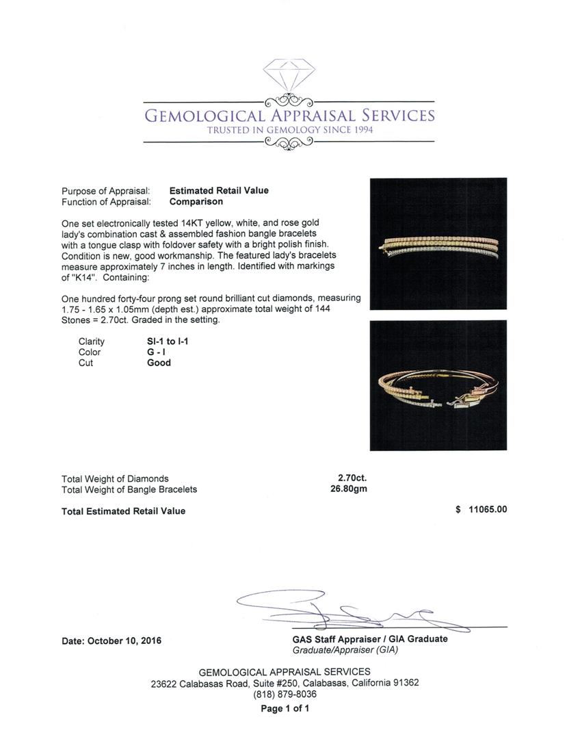 One set electronically tested 14KT yellow, white, and rose gold lady's combination cast & assembled fashion bangle bracelets with a tongue clasp with foldover safety with a bright polish finish. The featured lady's bracelets measure approximately 7 inches in length. Identified with markings of 'K14'. Condition is new, good workmanship. Containing: One Hundred Forty-Four prong set round brilliant cut diamonds, measuring 1.75 - 1.65 x 1.05mm (depth est.) approximate total weight of 144 Stones = 2.70ct. Graded in the setting. Clarity SI-1 to I-1. Color: G - I Cut Good. Total Weight of Diamonds 2.70ct.. Total Weight of Bangle Bracelets 26.80gm. GAS Appraised at $11,065.00.