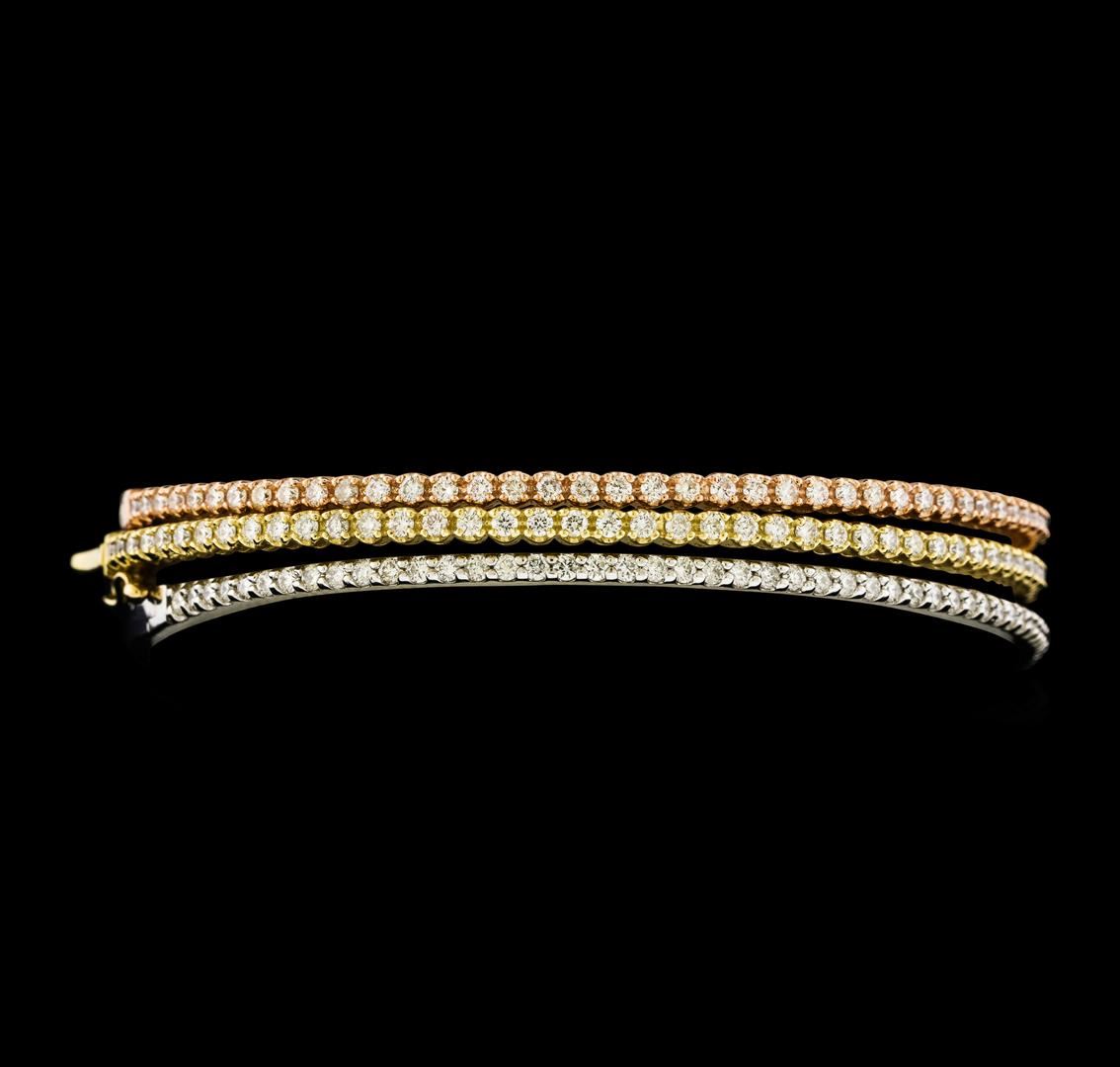 One set electronically tested 14KT yellow, white, and rose gold lady's combination cast & assembled fashion bangle bracelets with a tongue clasp with foldover safety with a bright polish finish. The featured lady's bracelets measure approximately 7 inches in length. Identified with markings of 'K14'. Condition is new, good workmanship. Containing: One Hundred Forty-Four prong set round brilliant cut diamonds, measuring 1.75 - 1.65 x 1.05mm (depth est.) approximate total weight of 144 Stones = 2.70ct. Graded in the setting. Clarity SI-1 to I-1. Color: G - I Cut Good. Total Weight of Diamonds 2.70ct.. Total Weight of Bangle Bracelets 26.80gm. GAS Appraised at $11,065.00.