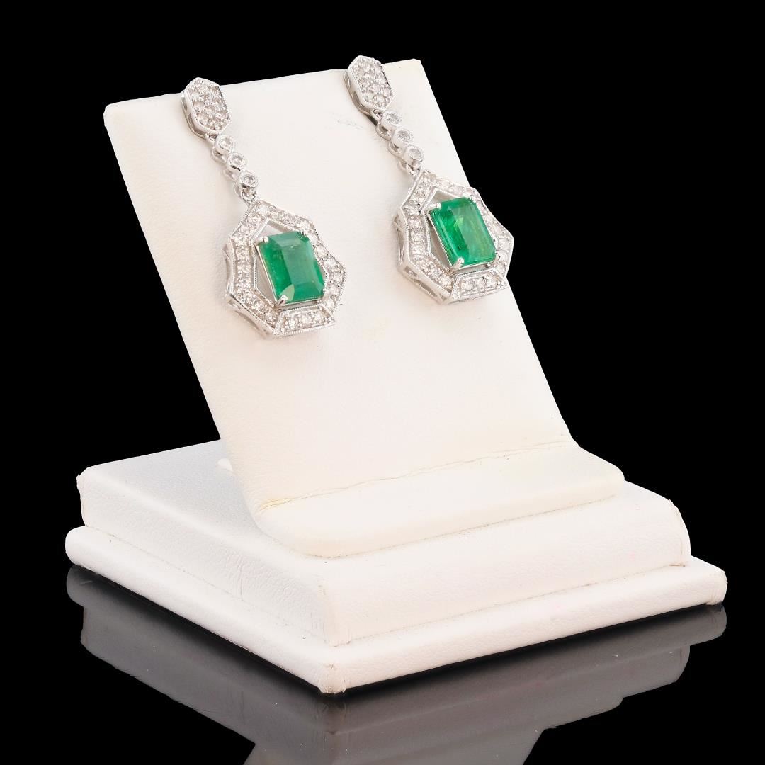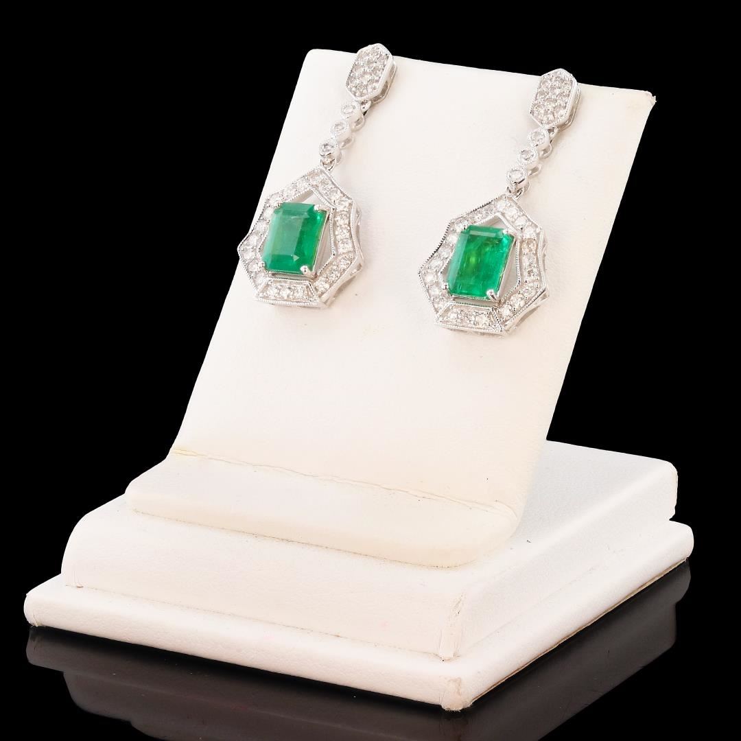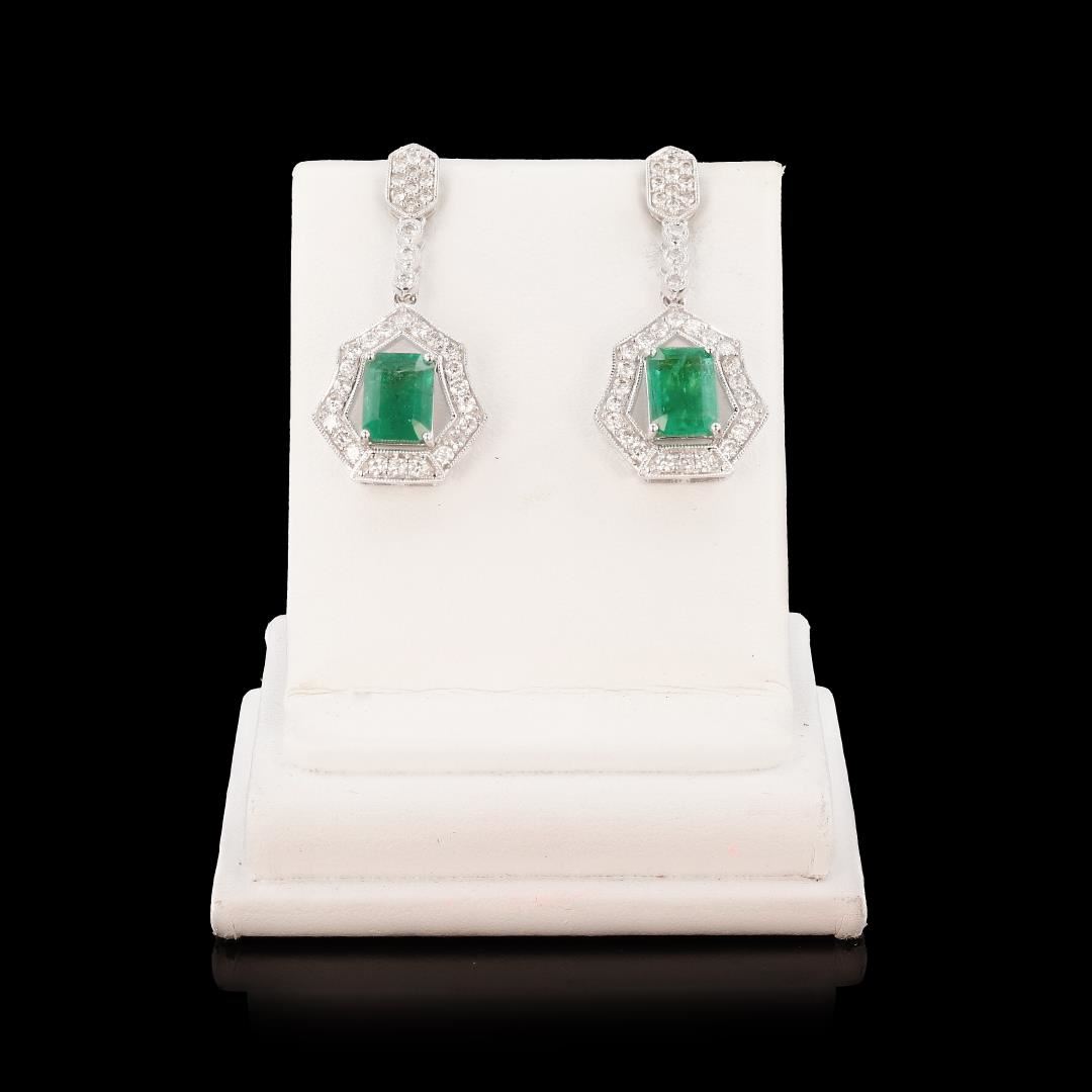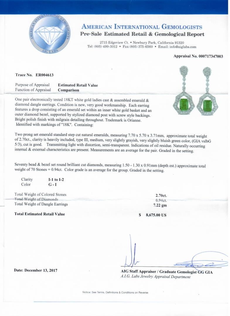 One pair electronically tested 18KT white gold ladies cast & assembled emerald & diamond dangle earrings. Condition is new, very good workmanship. Each earring features a drop consisting of an emerald set within an inner white gold basket and an outer diamond bezel, supported by stylized diamond post with screw style backings. Bright polish finish with milgrain detailing throughout. Trademark is Orianne. Identified with markings of "18K". Containing: Two prong set emerald standard step cut natural emeralds, measuring 7.70 x 5.70 x 3.7lmm, approximate total weight of 2.70ct., clarity is heavily included, type III, medium, very slightly grayish, very slightly bluish green color, (GIA vslbG 5/3), cut is good. Transmitting light with distortion, semi-transparent. Indications of oil residue. Naturally occurring internal & external characteristics are present. Measurements are an average for the pair. Graded in the setting. Seventy bead & bezel set round brilliant cut diamonds, measuring 1.50 - 1.30 x 0.91mm (depth est.) approximate total weight of 70 Stones = 0.94ct. Color grade is an average for the group. Graded in the setting. Clarity: I-1 to I-2 Color: G-I Total Weight of Colored Stones: 2.70ct. Total Weight of Diamonds: 0.94ct. Total Weight of Dangle Earrings: 7.22 gm #LREF-5184