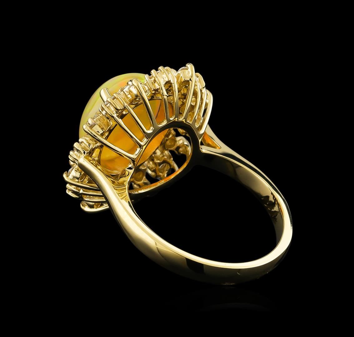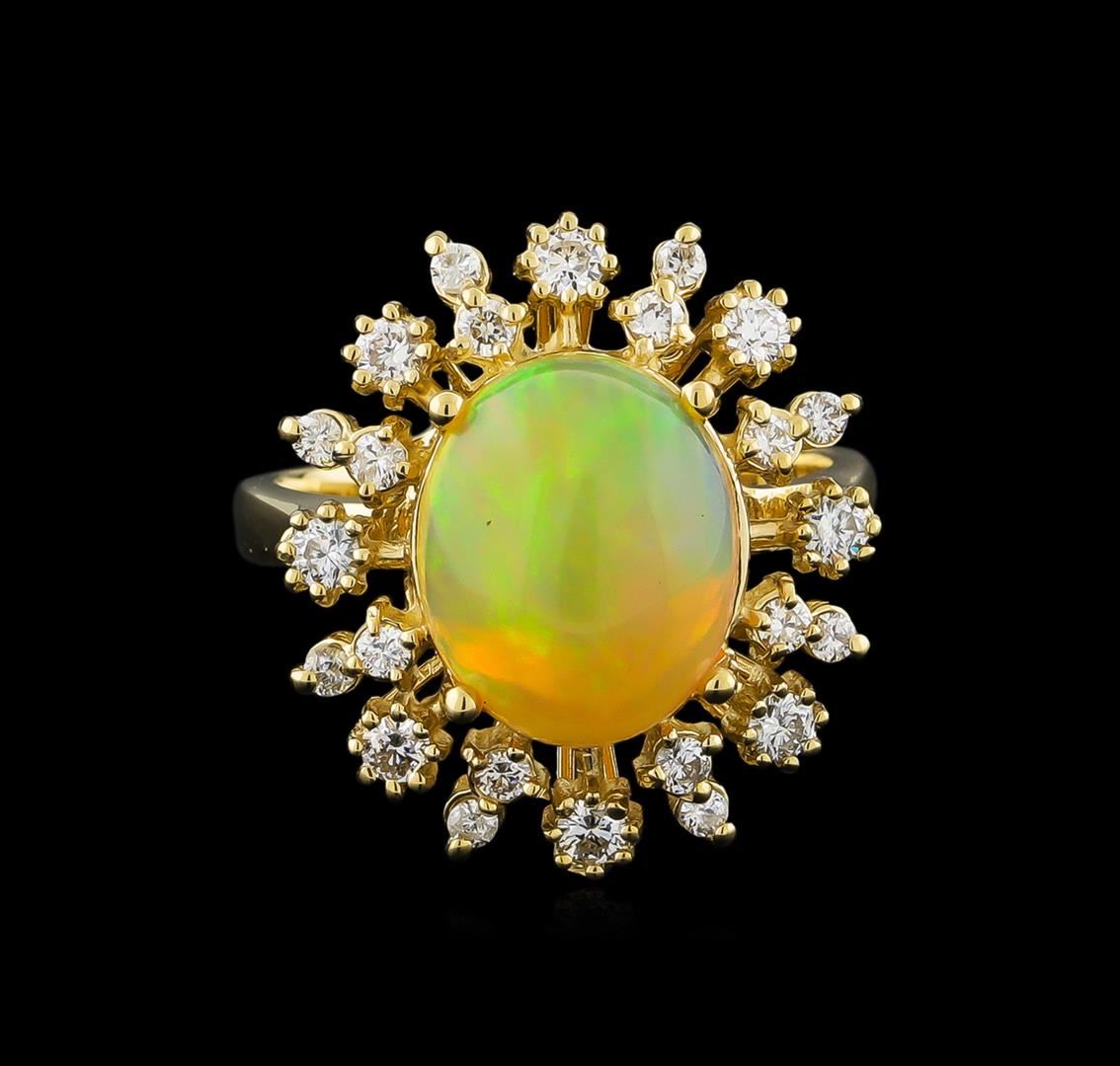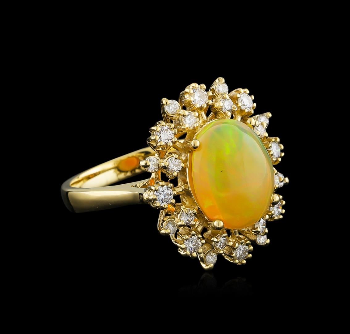 One electronically tested 14KT yellow gold lady's cast fashion ring with a basket double halo with a bright polish finish. The featured lady's ring has a shank measuring 2.61 millimeters wide. Identified with markings of "K14". Condition is new, good workmanship. Containing: One orange crystal that is cut in a oval shaped cabochon and is prong set, measuring 11.97 mm long x 9.81 mm wide, and 4.98 mm thick and the approximate weight is 2.70 carats. The opal has a somewhat bright, green-orange play of color (fire) in a rolling flashfire pattern; a medium dome; a good cut; no inclusions; consistent in its brightness and pattern; and is not directional. Graded in the setting. Eight prong set round brilliant cut diamonds, measuring 2.20 - 2.15 x 1.36mm (depth est.) approximate total weight of 8 Stones = 0.32ct. Graded in the setting. Clarity: SI-1 to SI-2. Color: G - Very Good Sixteen prong set round brilliant cut diamonds, measuring 1.80 - 1.60 x 1.05mm (depth est.) approximate total weight of 16 Stones = 0.31ct. Graded in the setting. Clarity: SI-1 to I-1. Color: H - I. Cut Good. Total Weight of Diamonds 0.63ct. Total Weight of Opals 2.70ct. Total Weight of Ring 6.00gm. GAS Appraised at $3,210.00.