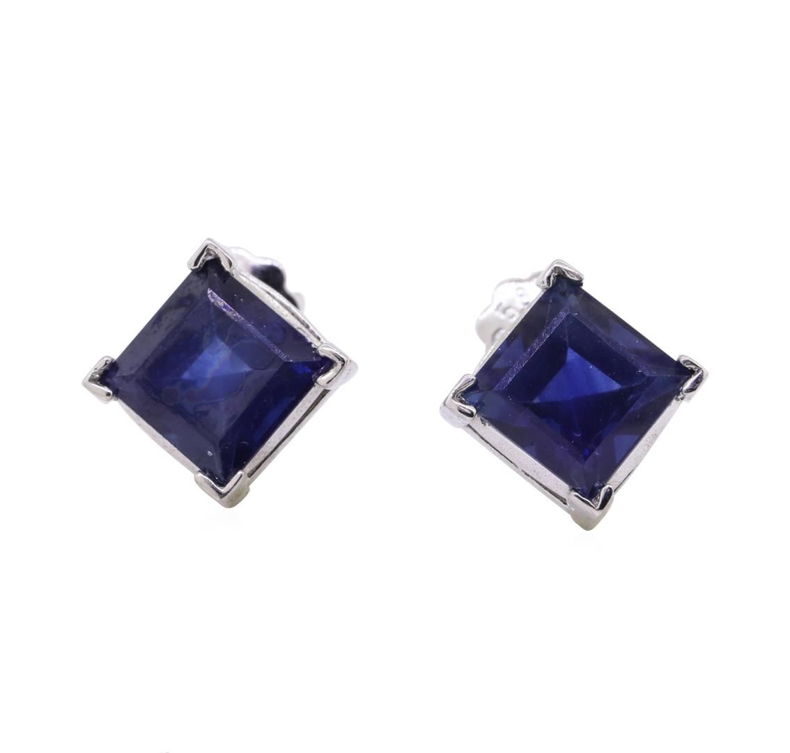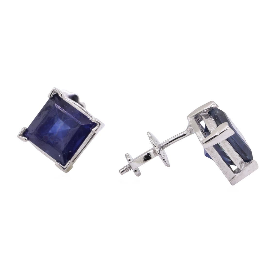 One pair of stud earrings with screw posts and backs featuring: 14KT white gold weighing 1.8 grams containing two square cut sapphires weighing 2.70ctw.