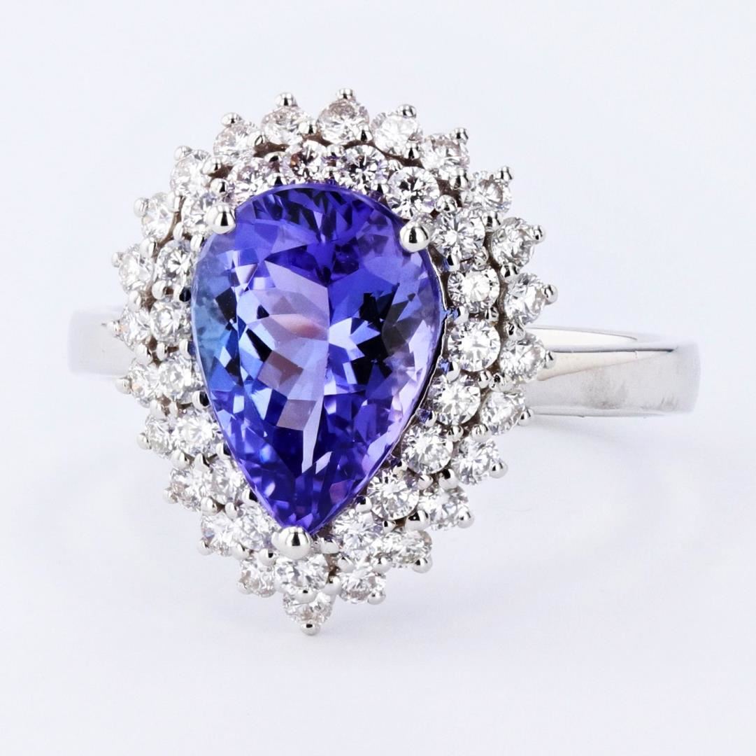 One polished, stamped, and tested 14K white gold ring with a bright finish. The ring is mounted with: 1 genuine tanzanite center stone weighing approximately 2.70 carat, and 43 genuine round diamonds weighing approximately 0.71 carats. This item weighs 3.5 grams, condition is new, excellent workmanship. MAIN GEMSTONE Species: Zoisite Variety: Tanzanite Shape: Pear Cutting Style: Modified Brilliant Cut Measurements: 10 x 8mm Weight: 2.70 carat Color: Bluish Violet Cut Grade: Very Good Refractive Index: 1.691 - 1.700 DR Birefringence: 0.008 - 0.013 Hardness: 6.5 - 7 ADJACENT GEMSTONES ON RING Identity: Natural Diamond Shape: Round Cutting Style: Brilliant Cut Quantity: 43 Diamonds Measurements: 1.5 - 1.7mm Total Weight: 0.71 carats Clarity Grade: SI1 to SI2 Color Grade: F - G Refractive Index: 2.418 Hardness: 10 TANZANITE WEIGHT: 2.70ct TOTAL DIAMOND WEIGHT: 0.71ctw WEIGHT OF ITEM: 3.5 grams GOLD CONTENT: 14K White Gold #Size: 6 3/4