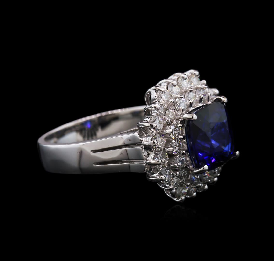One electronically tested 14KT white gold lady's cast fashion ring with a double halo with a bright polish finish. The featured ladies ring has a shank measuring 3.40 millimeters in width. Identified with markings of "14K". Condition is new, good workmanship. Containing: One prong set square cushion modified brilliant cut natural tanzanite, measuring 8.05 x 8.00 x 5.26mm, approximate weight of 2.70ct., clarity is eye clean, type I, medium dark, strong, bluish violet color, (GIA bV 6/5), cut is good. Transmitting light with no distortion, transparent. Colored gemstones are presumed to have been subjected to commonly used enhancement processes. Graded in the setting. Sixteen prong set round brilliant cut diamonds, measuring 2.10 - 2.00 x 1.33mm (depth est.) approximate total weight of 16 Stones = 0.55ct. Graded in the setting. Clarity: SI-1 to I-1. Color: H - I. Cut Good Twelve prong set round brilliant cut diamonds, measuring 1.90 - 1.80 x 1.20mm (depth est.) approximate total weight of 12 Stones = 0.30ct. Graded in the setting. Clarity: SI-1 to I-1. Color: H - I. Cut Good Eight prong set round brilliant cut diamonds, measuring 1.40 - 1.30 x 0.88mm (depth est.) approximate total weight of 8 Stones = 0.08ct. Clarity: SI-2 to I-1. Color: H - I. Cut Good. Total Weight of Colored Stones 2.70ct. Total Weight of Diamonds 0.93ct. Total Weight of Ring 7.00gm. GAS Appraised at $8,420.00.