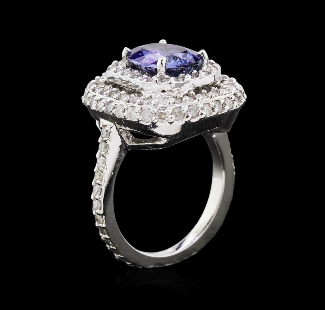 One 14KT white gold tanzanite and diamond ring. An oval cut tanzanite zoisite gemstone is prong mounted in the center of the ring. Round brilliant cut diamonds accent the ring around the center gemstone and on both sides. The ring is cast stamped "14K" and has a gross weight of 9.2 Grams. Diamond(s): Shape: Round Brilliant Cut. Weight: 1.68 carat. Average Clarity: I1. Average Color: H-J. Symmetry: Very Good. Polish: Very Good. GemStone(s): Tanzanite Zoisite. Nature: Natural. Shape: Oval, Faceted. Quantity: 1, Mounted. Weight: 2.70 carat. Dimensions: Length - 10.44 mm. ; Width - 8.43 mm. Bulge: Visible. Clarity: VS, Type 1. Color: Purplish Blue (4/5). Symmetry: Very Good. Color Intensity: Medium. Transparency: Translucent. Tone: Dark. Enhancements: Coated. Metal(s): Metal: Gold, Stamped. Purity: 14K. Color: White. Condition: Excellent. Finish: High polish. GGA Appraised at $7,980.00.