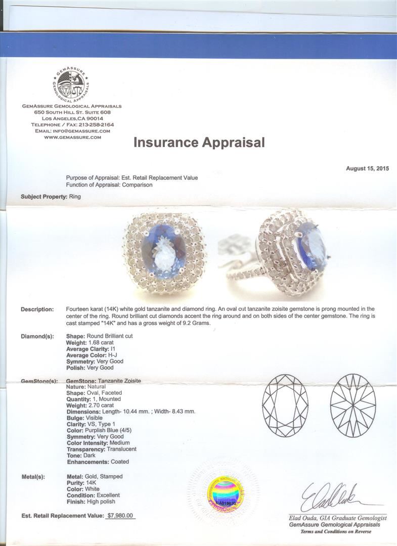 One 14KT white gold tanzanite and diamond ring. An oval cut tanzanite zoisite gemstone is prong mounted in the center of the ring. Round brilliant cut diamonds accent the ring around the center gemstone and on both sides. The ring is cast stamped "14K" and has a gross weight of 9.2 Grams. Diamond(s): Shape: Round Brilliant Cut. Weight: 1.68 carat. Average Clarity: I1. Average Color: H-J. Symmetry: Very Good. Polish: Very Good. GemStone(s): Tanzanite Zoisite. Nature: Natural. Shape: Oval, Faceted. Quantity: 1, Mounted. Weight: 2.70 carat. Dimensions: Length - 10.44 mm. ; Width - 8.43 mm. Bulge: Visible. Clarity: VS, Type 1. Color: Purplish Blue (4/5). Symmetry: Very Good. Color Intensity: Medium. Transparency: Translucent. Tone: Dark. Enhancements: Coated. Metal(s): Metal: Gold, Stamped. Purity: 14K. Color: White. Condition: Excellent. Finish: High polish. GGA Appraised at $7,980.00.