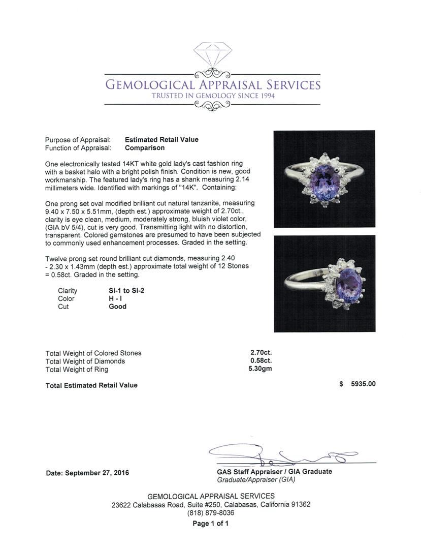 One electronically tested 14KT white gold lady's cast fashion ring with a basket halo with a bright polish finish. The featured lady's ring has a shank measuring 2.14 millimeters wide. Identified with markings of '14K'. Condition is new, good workmanship. Containing: One prong set oval modified brilliant cut natural tanzanite, measuring 9.40 x 7.50 x 5.51mm, (depth est.) approximate weight of 2.70ct., clarity is eye clean, medium, moderately strong, bluish violet color, (GIA bV 5/4), cut is very good. Transmitting light with no distortion, transparent. Colored gemstones are presumed to have been subjected to commonly used enhancement processes. Graded in the setting. Twelve prong set round brilliant cut diamonds, measuring 2.40 - 2.30 x 1.43mm (depth est.) approximate total weight of 12 Stones = 0.58ct. Graded in the setting. Clarity SI-1 to SI-2. Color: H - I Cut Good. Total Weight of Colored Stones 2.70ct.. Total Weight of Diamonds 0.58ct.. Total Weight of Ring 5.30gm. GAS Appraised at $5,935.00.