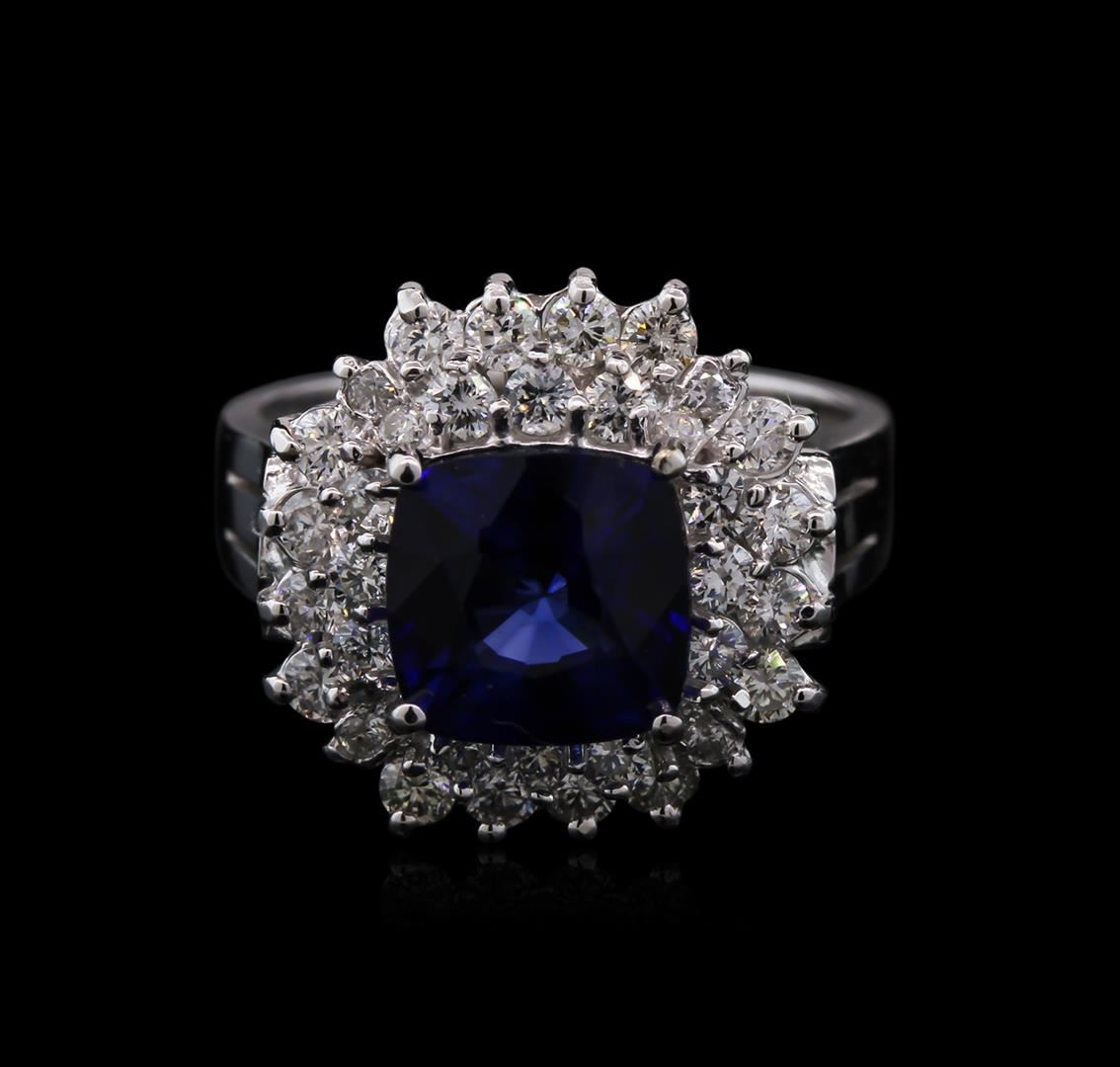 One electronically tested 14KT white gold lady's cast fashion ring with a double halo with a bright polish finish. The featured ladies ring has a shank measuring 3.40 millimeters in width. Identified with markings of "14K". Condition is new, good workmanship. Containing: One prong set square cushion modified brilliant cut natural tanzanite, measuring 8.05 x 8.00 x 5.26mm, approximate weight of 2.70ct., clarity is eye clean, type I, medium dark, strong, bluish violet color, (GIA bV 6/5), cut is good. Transmitting light with no distortion, transparent. Colored gemstones are presumed to have been subjected to commonly used enhancement processes. Graded in the setting. Sixteen prong set round brilliant cut diamonds, measuring 2.10 - 2.00 x 1.33mm (depth est.) approximate total weight of 16 Stones = 0.55ct. Graded in the setting. Clarity: SI-1 to I-1. Color: H - I. Cut Good Twelve prong set round brilliant cut diamonds, measuring 1.90 - 1.80 x 1.20mm (depth est.) approximate total weight of 12 Stones = 0.30ct. Graded in the setting. Clarity: SI-1 to I-1. Color: H - I. Cut Good Eight prong set round brilliant cut diamonds, measuring 1.40 - 1.30 x 0.88mm (depth est.) approximate total weight of 8 Stones = 0.08ct. Clarity: SI-2 to I-1. Color: H - I. Cut Good. Total Weight of Colored Stones 2.70ct. Total Weight of Diamonds 0.93ct. Total Weight of Ring 7.00gm. GAS Appraised at $8,420.00.