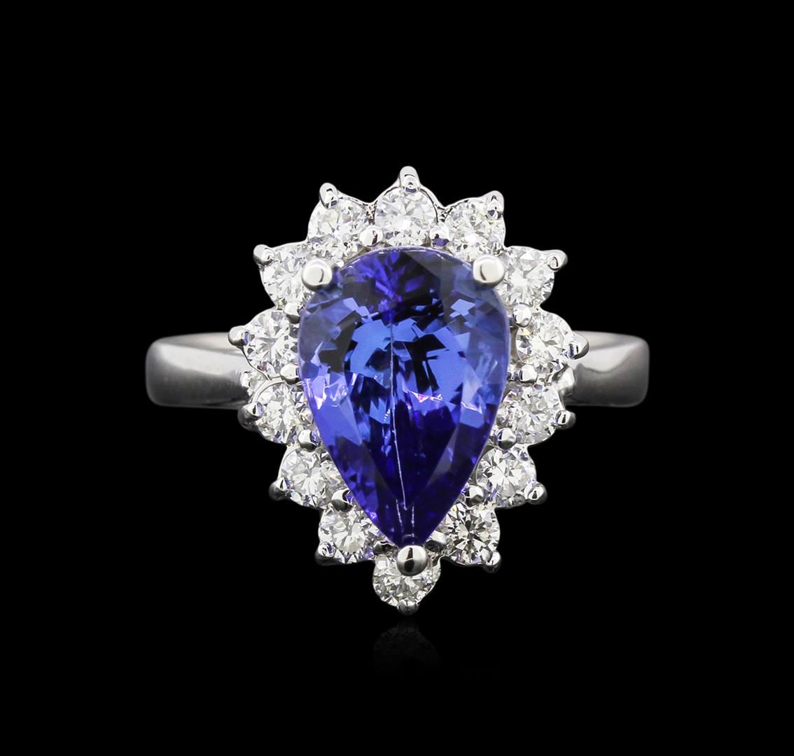 One stamped & tested 14KT white gold lady's cast cocktail ring with a half round shank with a bright polish finish. Condition is new. Containing: Fourteen prong set round brilliant cut diamonds, measuring 2.40 - 2.30 x 1.41mm (depth est.) approximate total weight of 14 Stones = 0.65ct. Clarity: SI-1 to SI-2. Color: H - I. Cut: Very Good. One prong set pear standard brilliant cut natural tanzanite, measuring 11.30 x 7.70 x 4.62mm, approximate weight of 2.70ct., clarity is eye clean, type I, medium dark, slightly grayish, bluish violet color, (GIA bV 6/2), cut is good. Total Weight of Colored Stones: 2.70ct. Total Weight of Diamonds: 0.65ct. Total Weight of Ring: 5.10 gm. GAS Appraised at $5,645.00.