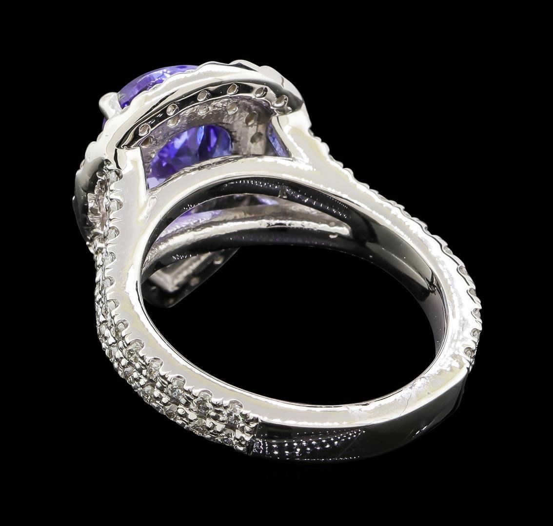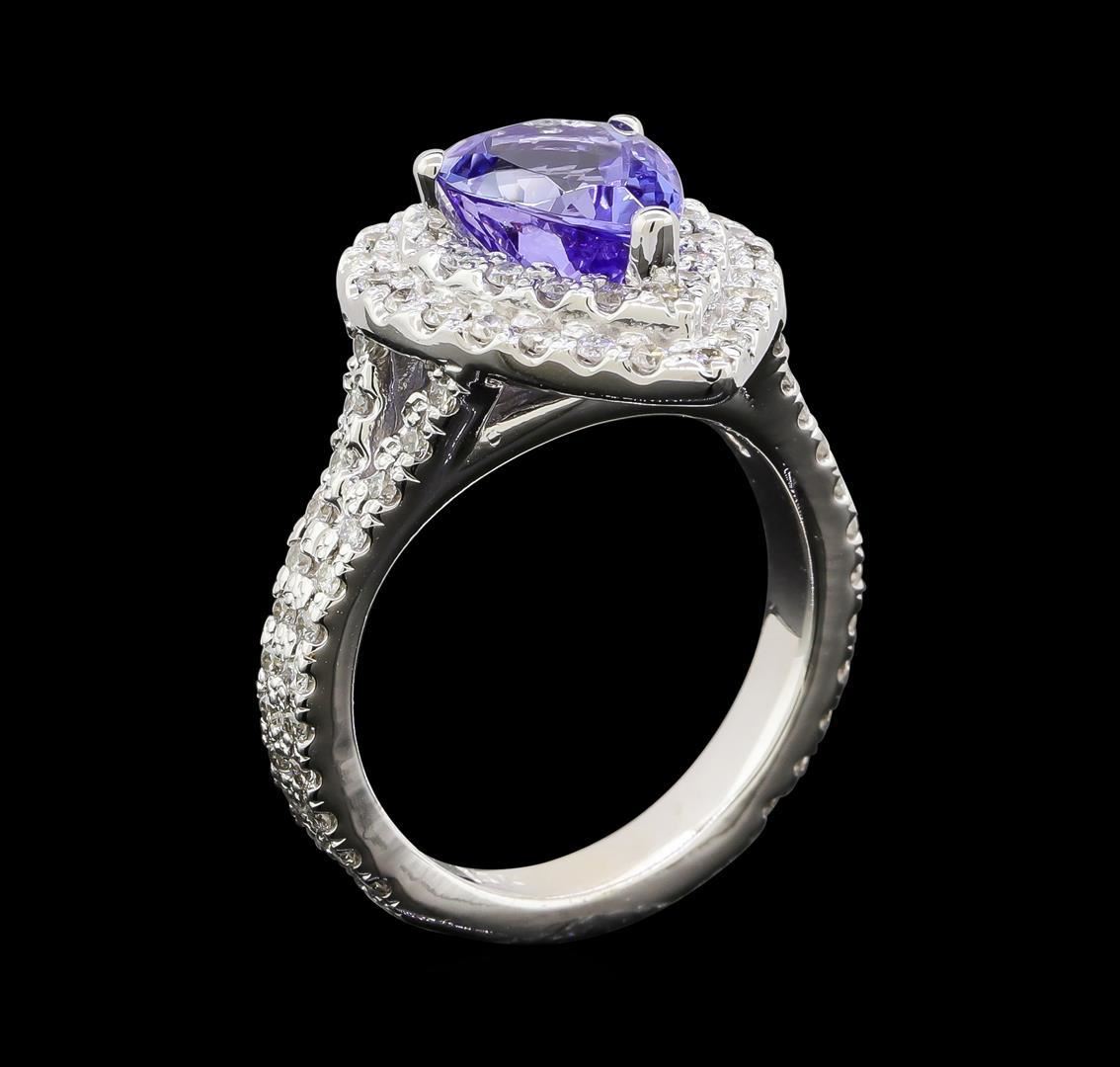 One electronically tested 14KT white gold lady's cast fashion ring with a split shank double halo with a bright polish finish. The featured lady's ring has a shank measuring 3.33 millimeters wide. Identified with markings of '14K'. Condition is new, good workmanship. Containing: One prong set pear modified brilliant cut natural tanzanite, measuring 10.18 x 7.46 x 5.38mm, (depth est.) approximate weight of 2.70ct., clarity is eye clean, medium, very slightly grayish, violet color, (GIA V 5/3), cut is good. Transmitting light with no distortion, transparent. Colored gemstones are presumed to have been subjected to commonly used enhancement processes. Graded in the setting. Thirty-Nine prong set round brilliant cut diamonds, measuring 1.50 - 1.45 x 0.89mm (depth est.) approximate total weight of 39 Stones = 0.46ct. Graded in the setting. Clarity SI-1 to I-1. Color: G - I Cut Good Forty-Eight prong set round brilliant cut diamonds, measuring 1.40 - 1.35 x 0.86mm (depth est.) approximate total weight of 48 Stones = 0.48ct. Graded in the setting. Clarity SI-1 to SI-2. Color: H - I Cut Good. Total Weight of Colored Stones 2.70ct.. Total Weight of Diamonds 0.94ct.. Total Weight of Ring 9.10gm.
