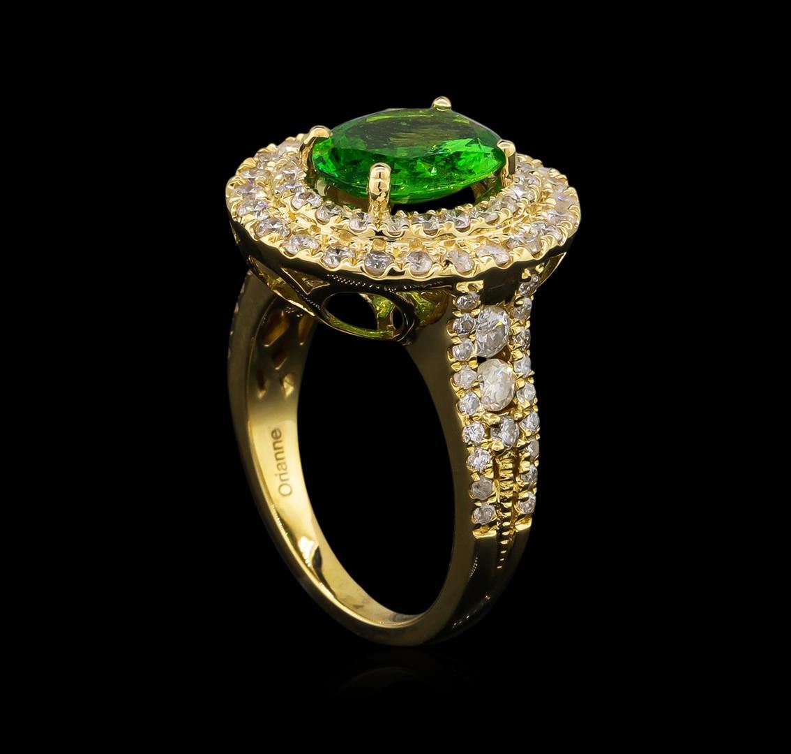 One electronically tested 14KT yellow gold lady's cast fashion ring with a basket double halo with a bright polish finish. The featured lady's ring has a shank measuring 2.26 millimeters wide. Trademark is Orianne. Identified with markings of "14K". Condition is new, good workmanship. Containing: One prong set oval modified brilliant cut natural tsavorite garnet, measuring 10.79 x 8.60 x 3.80mm, approximate weight of 2.70ct., clarity is slightly included, type II, medium, moderately strong, slightly yellowish green color, (GIA slyG 5/4), cut is good. Transmitting light with a minimum of distortion, transparent. Colored gemstones are presumed to have been subjected to commonly used enhancement processes. Graded in the setting. Four channel set round brilliant cut diamonds, measuring 2.70 - 2.60 x 1.64mm (depth est.) approximate total weight of 4 Stones = 0.28ct. Graded in the setting. Clarity: I-1 to I-2. Color: G - Good Twenty-Six prong set round brilliant cut diamonds, measuring 1.90 - 1.80 x 1.11mm (depth est.) approximate total weight of 26 Stones = 0.60ct. Graded in the setting. Clarity: I-1 to I-2. Color: G - I. Cut Good Twenty-Two prong set round brilliant cut diamonds, measuring 1.60 - 1.50 x 0.93mm (depth est.) approximate total weight of 22 Stones = 0.30ct. Graded in the setting. Clarity: SI-2 to I-2. Color: H - I. Cut Good Forty prong set round brilliant cut diamonds, measuring 1.30 - 1.20 x 0.75mm (depth est.) approximate total weight of 40 Stones = 0.28ct. Graded in the setting. Clarity: SI-2 to I-2. Color: G - I. Cut Good. Total Weight of Colored Stones 2.70ct. Total Weight of Diamonds 1.46ct. Total Weight of Ring 7.70gm. GAS Appraised at $12,275.00.