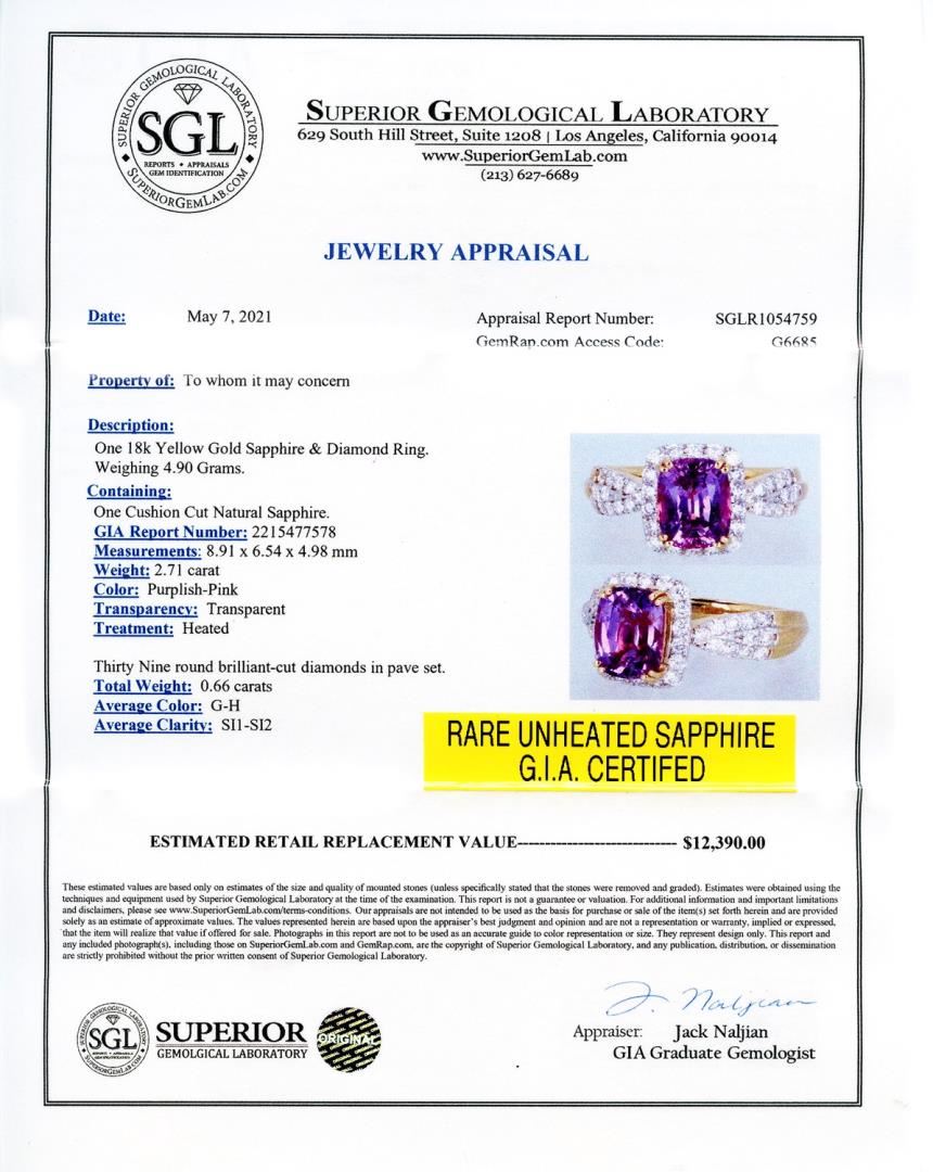 One 18k Yellow Gold Sapphire & Diamond Ring. Weighing 4.90 Grams. Containing: One Cushion Cut Natural Sapphire. GIA Report Number: 2215477578 Measurements: 8.91 x 6.54 x 4.98mm Weight: 2.71 carat Color: Purplish-Pink Transparency: Transparent Treatment: Heated Thirty Nine round brilliant-cut diamonds in pave set. Total Weight: 0.66 carats Average Color: G - H Average Clarity: SI1 to SI2 #LREF-6998