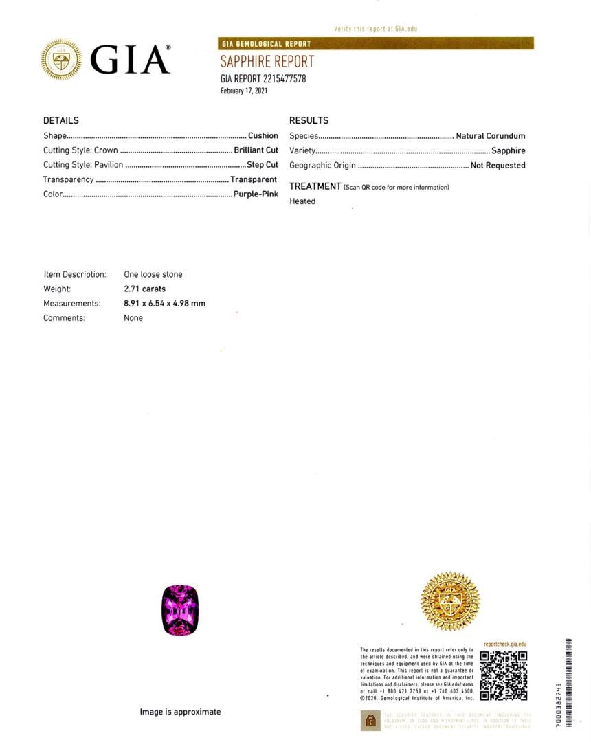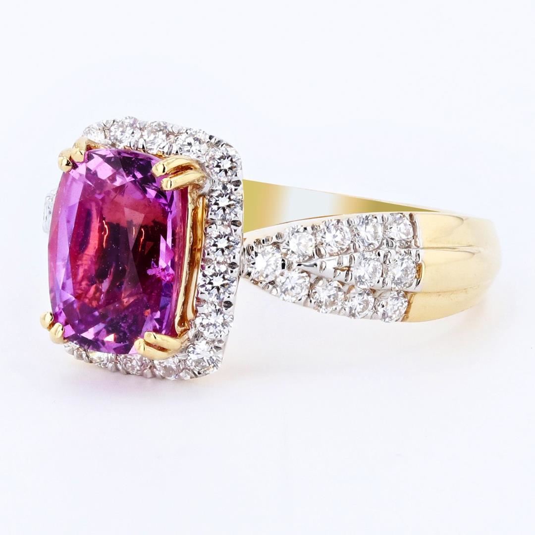 One 18k Yellow Gold Sapphire & Diamond Ring. Weighing 4.90 Grams. Containing: One Cushion Cut Natural Sapphire. GIA Report Number: 2215477578 Measurements: 8.91 x 6.54 x 4.98mm Weight: 2.71 carat Color: Purplish-Pink Transparency: Transparent Treatment: Heated Thirty Nine round brilliant-cut diamonds in pave set. Total Weight: 0.66 carats Average Color: G - H Average Clarity: SI1 to SI2 Size: 6 1/2