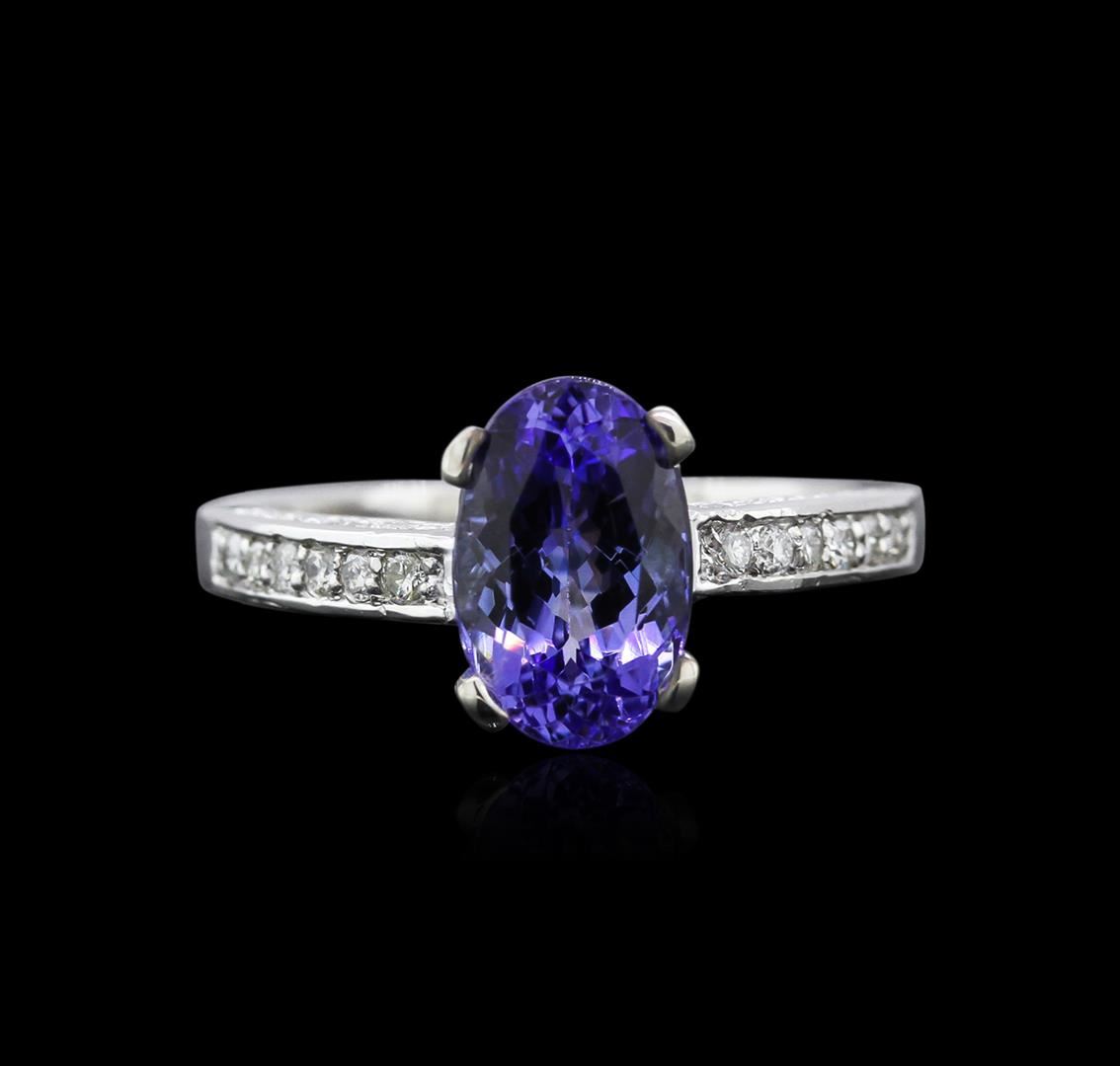 One electronically tested 14KT white gold ladies cast tanzanite and diamond ring with a bright polish finish. The featured tanzanite is supported by a diamond under gallery and diamond set shoulders, completed by a two and one-half millimeter wide band. Identified with markings of "14K". Condition is new, good workmanship. Containing: One prong set oval mixed cut natural tanzanite approximate weight of 2.71ct., clarity is eye clean, type I, medium dark, very slightly grayish, bluish violet color, (GIA bV 6/3), cut is good. Transmitting light with no distortion, transparent. Graded in the setting. Tanzanite is a very rare gemstone that is only found in the country of Tanzania. Originally discovered in 1967. Tiffany & Company, named the stone Tanzanite. It is found in the Usumburu Mountains that border the Umba Valley of northern Tanzania. Tanzanite occurs in gray, brown, violet, blue, reddish-purple, & green. The gem is interesting because of its exceptional pleochroism. Rotated in different directions a tanzanite will exhibit multiple changes of color. Tanzanite has a low tolerance to ultrasonic cleaning, and should not be cleaned using this method. Ninety-Two prong set round brilliant cut diamonds approximate total weight of 92 Stones = 0.50ct. Graded in the setting. Clarity SI-1 to SI-2 Color H - J. Total Weight of Colored Stones 2.71ct. Total Weight of Diamonds 0.50ct. Total Weight of Ring 4.59 grams. AIG Appraised at $8,420.00.