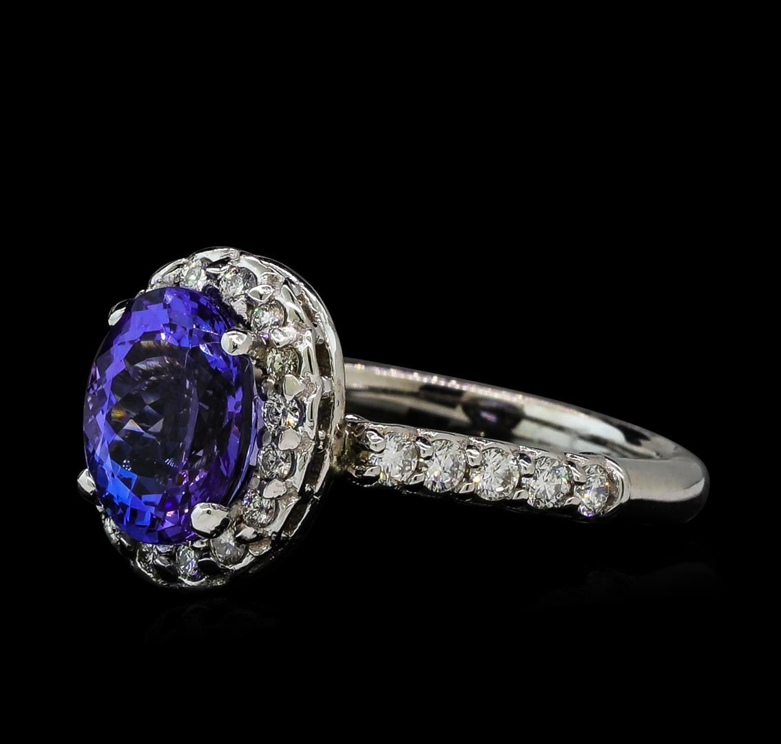 One electronically tested 14KT white gold ladies cast & assembled tanzanite and diamond ring with a bright polish finish. The featured tanzanite is set within a diamond bezel supported by a diamond accented under gallery and diamond set shoulders, completed by a two millimeter wide band. Identified with markings of '14K'. Condition is new, good workmanship. Containing: One prong set oval mixed cut natural tanzanite, measuring 9.40 x 7.50 x 5.30mm, 3%. bulge factor, approximate weight of 2.71ct., clarity is eye clean, type I, medium, very slightly grayish, bluish violet color, (GIA bV 5/3), cut is good. Transmitting light with no distortion, transparent. Graded in the setting. Tanzanite is a very rare gemstone that is only found in the country of Tanzania. Originally discovered in 1967. Tiffany & Company, named the stone Tanzanite. It is found in the Usumburu Mountains that border the Umba Valley of northern Tanzania. Tanzanite occurs in gray, brown, violet, blue, reddish-purple, & green. The gem is interesting because of its exceptional pleochroism. Rotated in different directions a tanzanite will exhibit multiple changes of color. Tanzanite has a low tolerance to ultrasonic cleaning, and should not be cleaned using this method. Twelve prong & bezel set round brilliant cut diamonds, measuring 2.00 - 2.00 x 1.20mm (depth est.) approximate total weight of 12 Stones = 0.40ct. Graded in the setting. Clarity SI-2 to I-2. Color: F - H Sixteen prong set round brilliant cut diamonds, measuring 1.50 - 1.50 x 0.90mm (depth est.) approximate total weight of 16 Stones = 0.24ct. Graded in the setting. Clarity SI-2 to I-2. Color: G - I. Total Weight of Colored Stones 2.71ct.. Total Weight of Diamonds 0.64ct.. Total Weight of Ring 4.89gm. AIG Appraised at $7,305.00.
