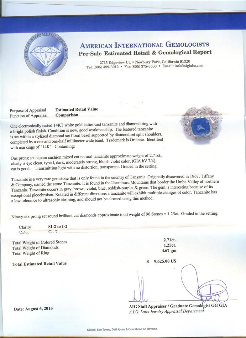 One electronically tested 14KT white gold ladies cast tanzanite and diamond ring with a bright polish finish. The featured tanzanite is set within a stylized diamond set floral bezel supported by diamond set split shoulders, completed by a one and one-half millimeter wide band. Trademark is Orianne. Identified with markings of "14K". Condition is new, good workmanship. Containing: One prong set square cushion mixed cut natural tanzanite approximate weight of 2.71ct., clarity is eye clean, type I, dark, moderately strong, bluish violet color, (GIA bV 7/4), cut is good. Transmitting light with no distortion, transparent. Graded in the setting. Tanzanite is a very rare gemstone that is only found in the country of Tanzania. Originally discovered in 1967. Tiffany & Company, named the stone Tanzanite. It is found in the Usumburu Mountains that border the Umba Valley of northern Tanzania. Tanzanite occurs in gray, brown, violet, blue, reddish-purple, & green. The gem is interesting because of its exceptional pleochroism. Rotated in different directions a tanzanite will exhibit multiple changes of color. Tanzanite has a low tolerance to ultrasonic cleaning, and should not be cleaned using this method. Ninety-Six prong set round brilliant cut diamonds approximate total weight of 96 Stones = 1.25ct. Graded in the setting. Clarity: SI-2 to I-2. Color: G - I. Total Weight of Colored Stones 2.71ct. Total Weight of Diamonds 1.25ct. Total Weight of Ring 4.67gm. AIG Appraised at $9,625.00.