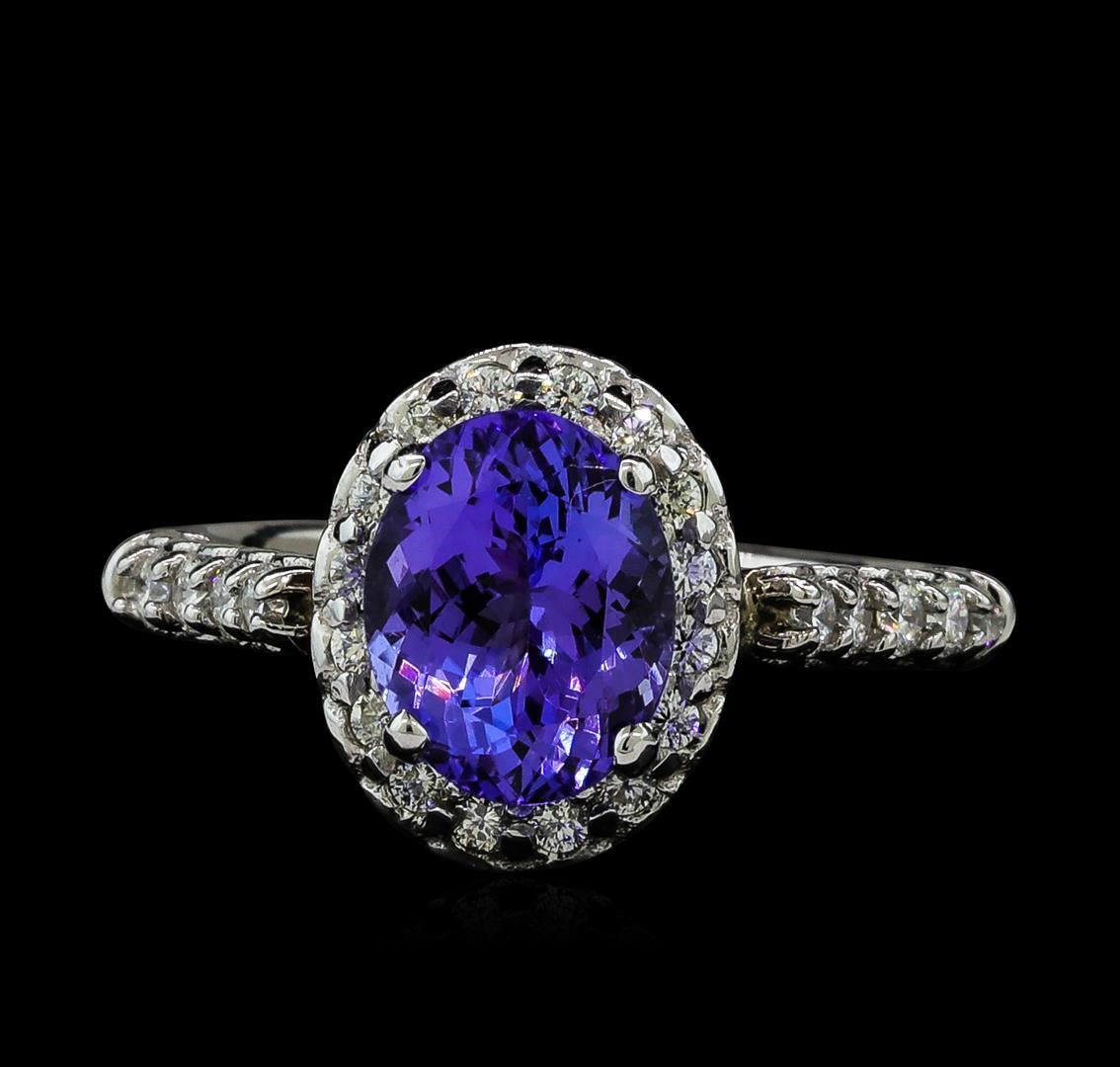One electronically tested 14KT white gold ladies cast & assembled tanzanite and diamond ring with a bright polish finish. The featured tanzanite is set within a diamond bezel supported by a diamond accented under gallery and diamond set shoulders, completed by a two millimeter wide band. Identified with markings of '14K'. Condition is new, good workmanship. Containing: One prong set oval mixed cut natural tanzanite, measuring 9.40 x 7.50 x 5.30mm, 3%. bulge factor, approximate weight of 2.71ct., clarity is eye clean, type I, medium, very slightly grayish, bluish violet color, (GIA bV 5/3), cut is good. Transmitting light with no distortion, transparent. Graded in the setting. Tanzanite is a very rare gemstone that is only found in the country of Tanzania. Originally discovered in 1967. Tiffany & Company, named the stone Tanzanite. It is found in the Usumburu Mountains that border the Umba Valley of northern Tanzania. Tanzanite occurs in gray, brown, violet, blue, reddish-purple, & green. The gem is interesting because of its exceptional pleochroism. Rotated in different directions a tanzanite will exhibit multiple changes of color. Tanzanite has a low tolerance to ultrasonic cleaning, and should not be cleaned using this method. Twelve prong & bezel set round brilliant cut diamonds, measuring 2.00 - 2.00 x 1.20mm (depth est.) approximate total weight of 12 Stones = 0.40ct. Graded in the setting. Clarity SI-2 to I-2. Color: F - H Sixteen prong set round brilliant cut diamonds, measuring 1.50 - 1.50 x 0.90mm (depth est.) approximate total weight of 16 Stones = 0.24ct. Graded in the setting. Clarity SI-2 to I-2. Color: G - I. Total Weight of Colored Stones 2.71ct.. Total Weight of Diamonds 0.64ct.. Total Weight of Ring 4.89gm. AIG Appraised at $7,305.00.