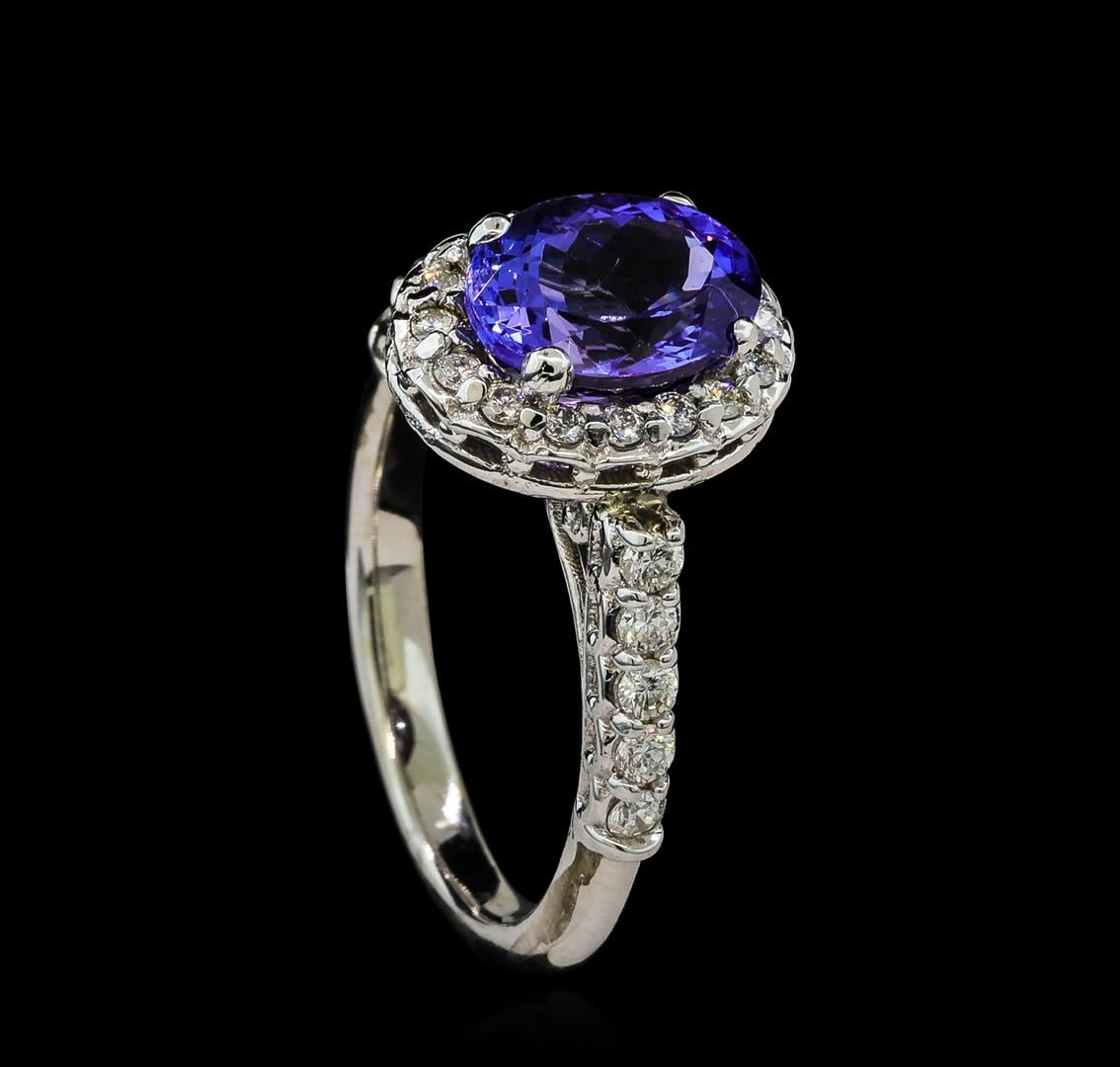 One electronically tested 14KT white gold ladies cast & assembled tanzanite and diamond ring with a bright polish finish. The featured tanzanite is set within a diamond bezel supported by a diamond accented under gallery and diamond set shoulders, completed by a two millimeter wide band. Identified with markings of '14K'. Condition is new, good workmanship. Containing: One prong set oval mixed cut natural tanzanite, measuring 9.40 x 7.50 x 5.30mm, 3%. bulge factor, approximate weight of 2.71ct., clarity is eye clean, type I, medium, very slightly grayish, bluish violet color, (GIA bV 5/3), cut is good. Transmitting light with no distortion, transparent. Graded in the setting. Tanzanite is a very rare gemstone that is only found in the country of Tanzania. Originally discovered in 1967. Tiffany & Company, named the stone Tanzanite. It is found in the Usumburu Mountains that border the Umba Valley of northern Tanzania. Tanzanite occurs in gray, brown, violet, blue, reddish-purple, & green. The gem is interesting because of its exceptional pleochroism. Rotated in different directions a tanzanite will exhibit multiple changes of color. Tanzanite has a low tolerance to ultrasonic cleaning, and should not be cleaned using this method. Twelve prong & bezel set round brilliant cut diamonds, measuring 2.00 - 2.00 x 1.20mm (depth est.) approximate total weight of 12 Stones = 0.40ct. Graded in the setting. Clarity SI-2 to I-2. Color: F - H Sixteen prong set round brilliant cut diamonds, measuring 1.50 - 1.50 x 0.90mm (depth est.) approximate total weight of 16 Stones = 0.24ct. Graded in the setting. Clarity SI-2 to I-2. Color: G - I. Total Weight of Colored Stones 2.71ct.. Total Weight of Diamonds 0.64ct.. Total Weight of Ring 4.89gm.