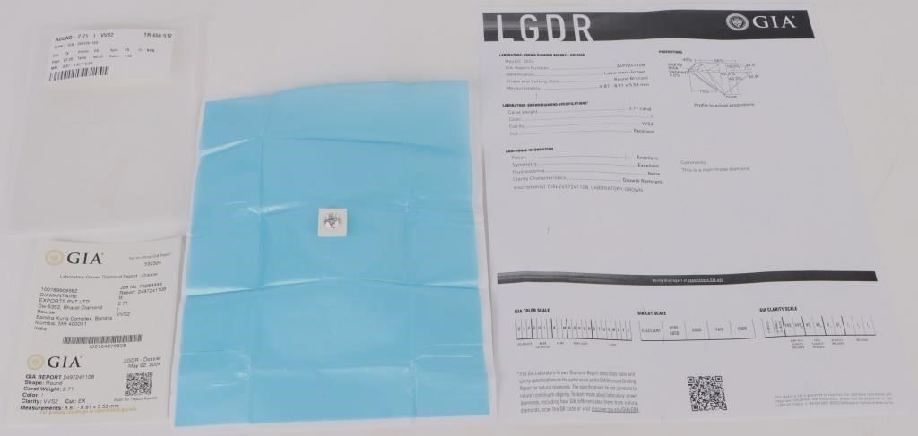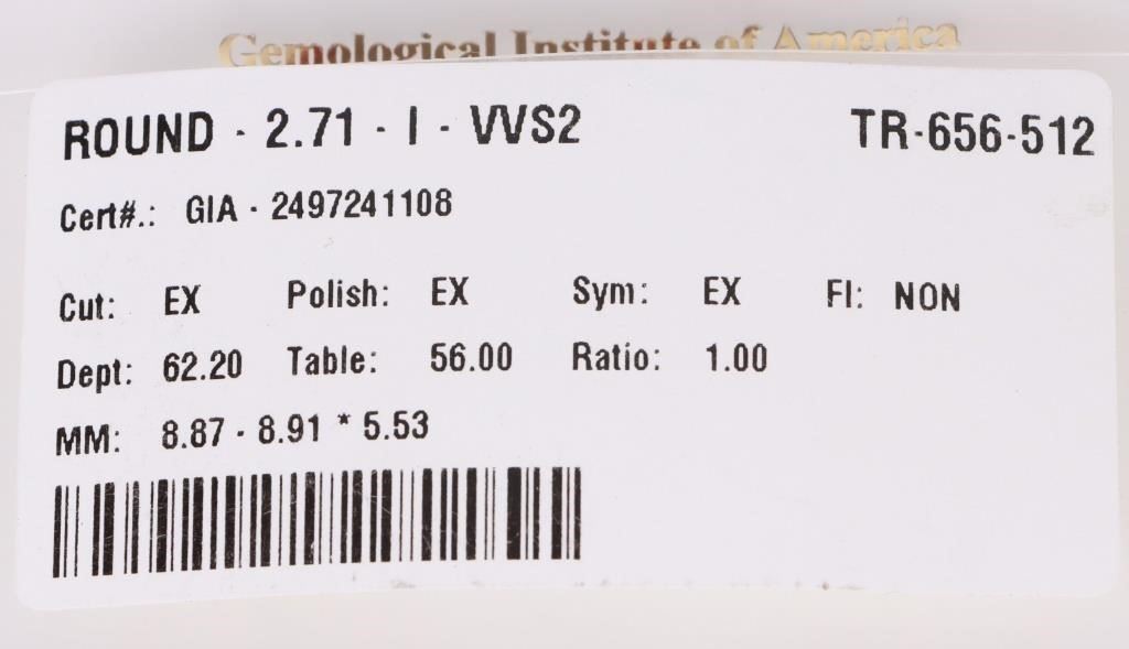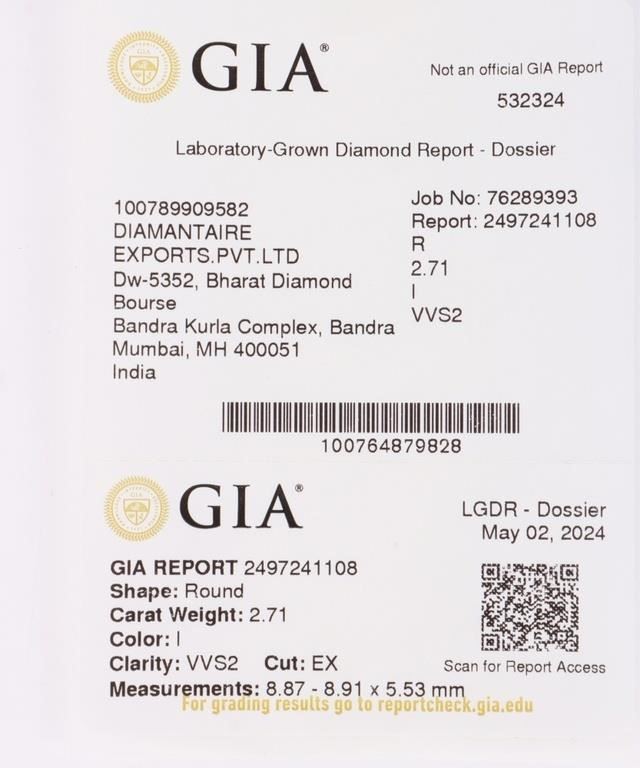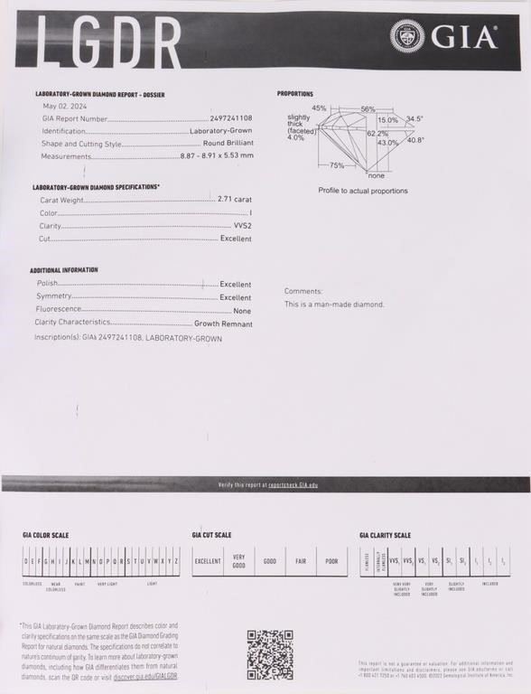 2.71ct VVS2 color I round diamond with GIA report. Diamond is lab grown, see report for more details.