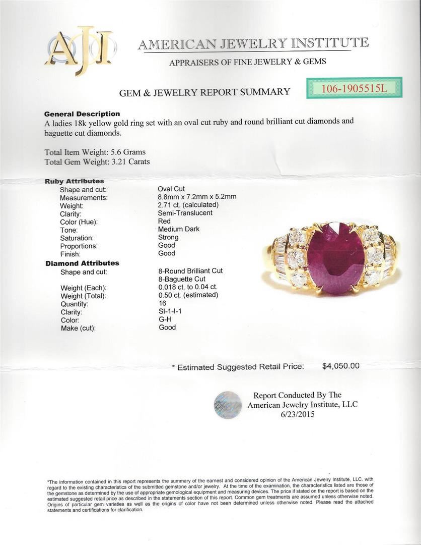 A ladies 18k yellow gold ring set with an oval cut ruby and round brilliant cut diamonds and baguette cut diamonds. Total Item Weight: 5.6 Grams. Total Gem Weight: 3.21 Carats. Ruby Attributes: Shape and cut: Oval Cut. Measurements: 8.8mm x 7.2mm x 5.2mm. Weight: 2.71 ct. (calculated). Clarity: Semi-Translucent. Color (Hue): Red. Tone: Medium Dark. Saturation: Strong. Proportions: Good. Finish: Good. Diamond Attributes: Shape and cut: 8-Round Brilliant Cut 8- Baguette Cut. Weight (Each): 0.018 ct. to 0.04 ct. Weight (Total): 0.50 ct. (estimated). Quantity: 16. Clarity: SI-1-I-1. Color: G-H. Make (cut): Good. AJI Appraised at $4,050.00.